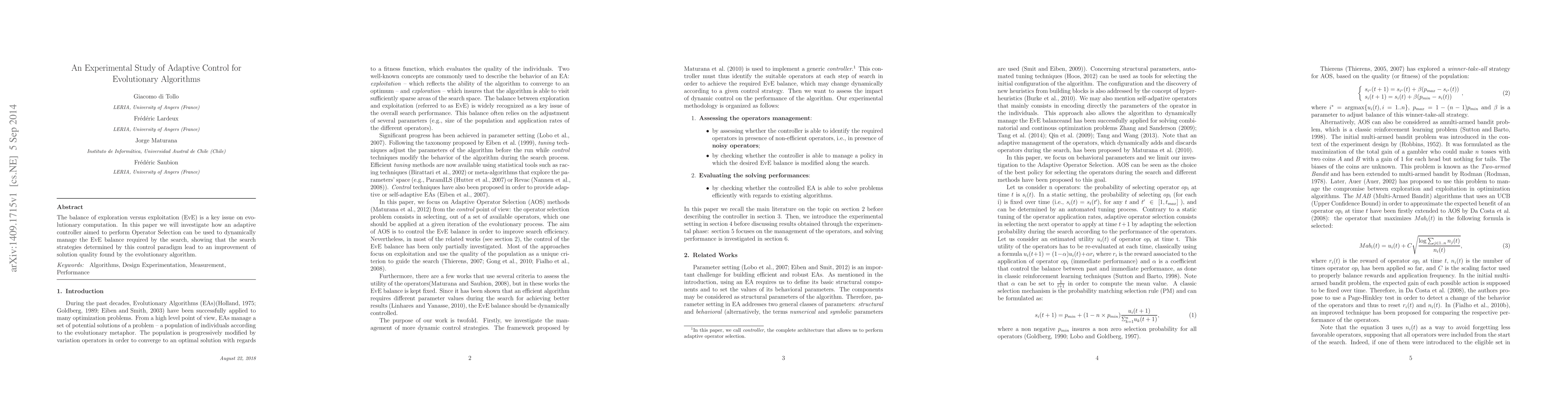 This paper explores adaptive control for evolutionary algorithms to dynamically manage the exploration versus exploitation balance, demonstrating that operator selection through adaptive control enhances solution quality.