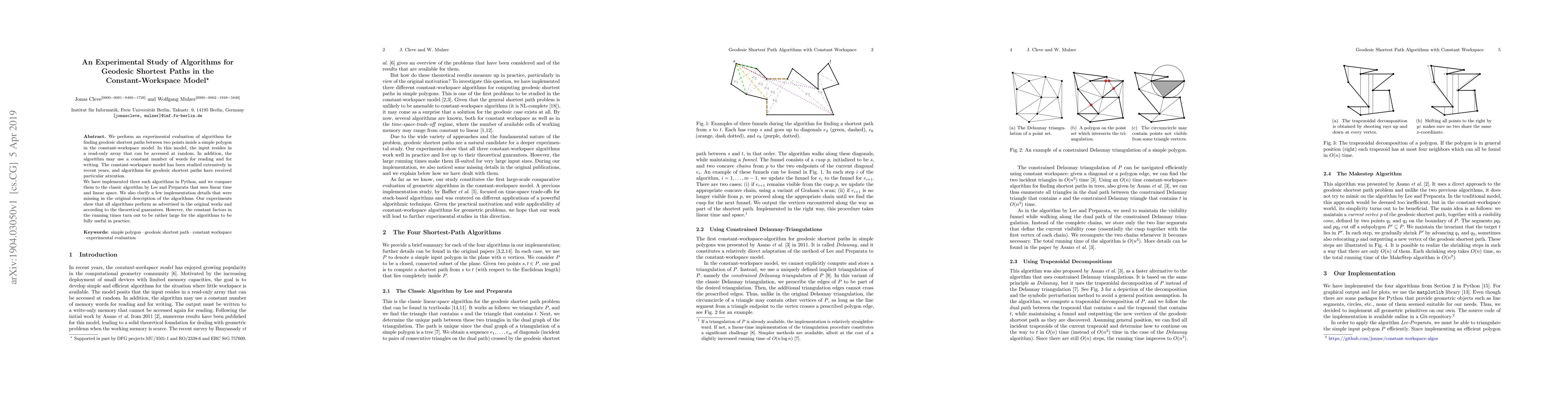 We perform an experimental evaluation of algorithms for finding geodesic shortest paths between two points inside a simple polygon in the constant-workspace model. In this model, the input resides in a read-only array that can be accessed at random. In addition, the algorithm may use a constant number of words for reading and for writing. The constant-workspace model has been studied extensively in recent years, and algorithms for geodesic shortest paths have received particular attention. We have implemented three such algorithms in Python, and we compare them to the classic algorithm by Lee and Preparata that uses linear time and linear space. We also clarify a few implementation details that were missing in the original description of the algorithms. Our experiments show that all algorithms perform as advertised in the original works and according to the theoretical guarantees. However, the constant factors in the running times turn out to be rather large for the algorithms to be fully useful in practice.