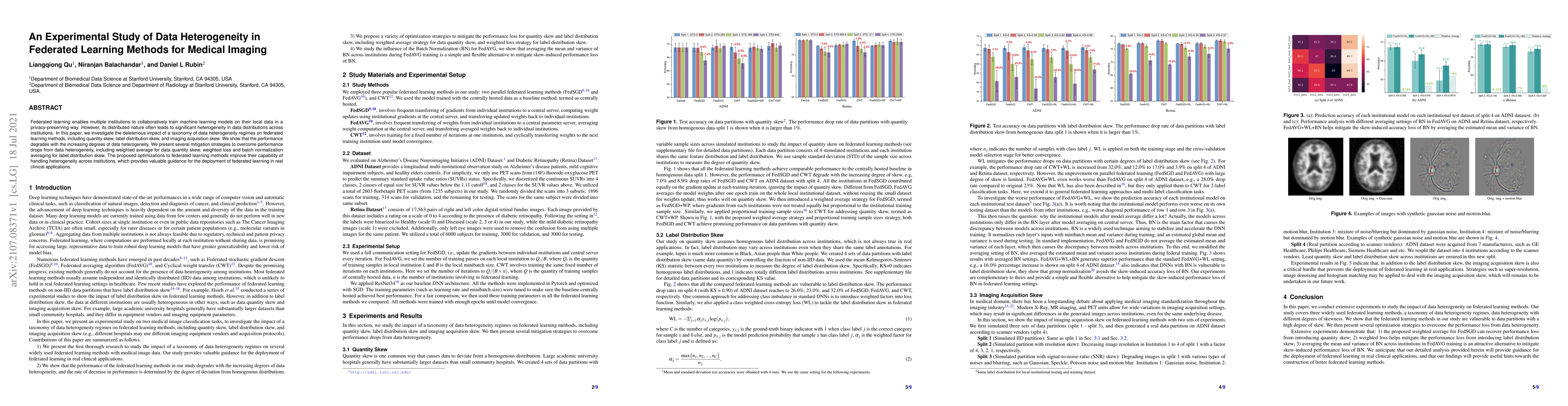 Federated learning enables multiple institutions to collaboratively train machine learning models on their local data in a privacy-preserving way. However, its distributed nature often leads to significant heterogeneity in data distributions across institutions. In this paper, we investigate the deleterious impact of a taxonomy of data heterogeneity regimes on federated learning methods, including quantity skew, label distribution skew, and imaging acquisition skew. We show that the performance degrades with the increasing degrees of data heterogeneity. We present several mitigation strategies to overcome performance drops from data heterogeneity, including weighted average for data quantity skew, weighted loss and batch normalization averaging for label distribution skew. The proposed optimizations to federated learning methods improve their capability of handling heterogeneity across institutions, which provides valuable guidance for the deployment of federated learning in real clinical applications.