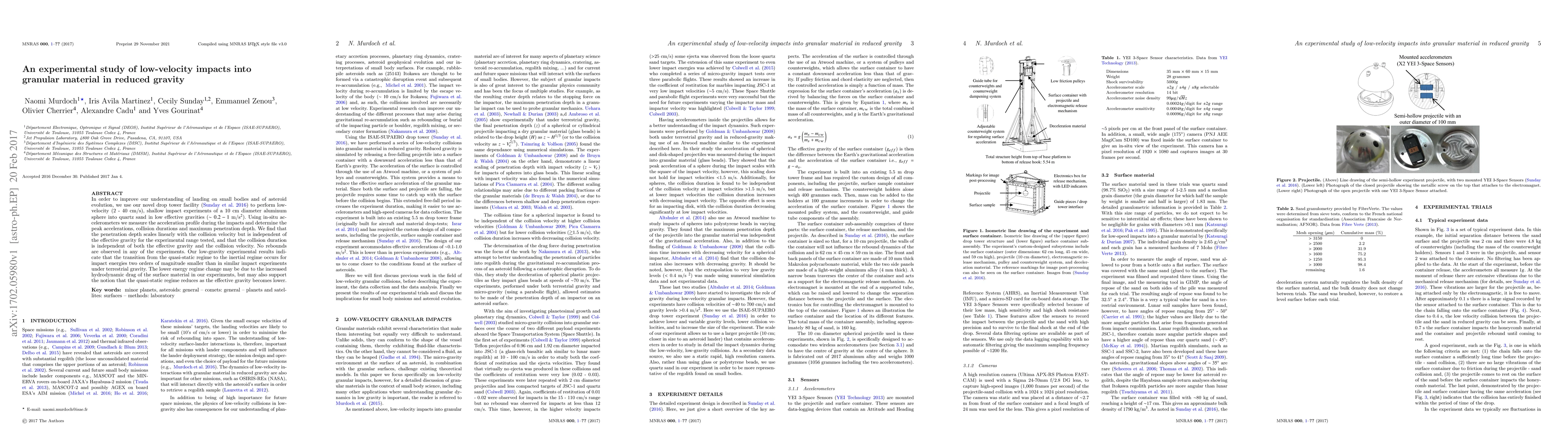 In order to improve our understanding of landing on small bodies and of asteroid evolution, we use our novel drop tower facility to perform low-velocity (2-40 cm s^-1), shallow impact experiments of a 10 cm diameter aluminum sphere into quartz sand in low effective gravities (~0.2-1 m s^-2). Using in situ accelerometers, we measure the acceleration profile during the impacts and determine the peak accelerations, collision durations and maximum penetration depth. We find that the penetration depth scales linearly with the collision velocity but is independent of the effective gravity for the experimental range tested, and that the collision duration is independent of both the effective gravity and the collision velocity. No rebounds are observed in any of the experiments. Our low-gravity experimental results indicate that the transition from the quasi-static regime to the inertial regime occurs for impact energies two orders of magnitude smaller than in similar impact experiments under terrestrial gravity. The lower energy regime change may be due to the increased hydrodynamic drag of the surface material in our experiments, but may also support the notion that the quasi-static regime reduces as the effective gravity becomes lower.