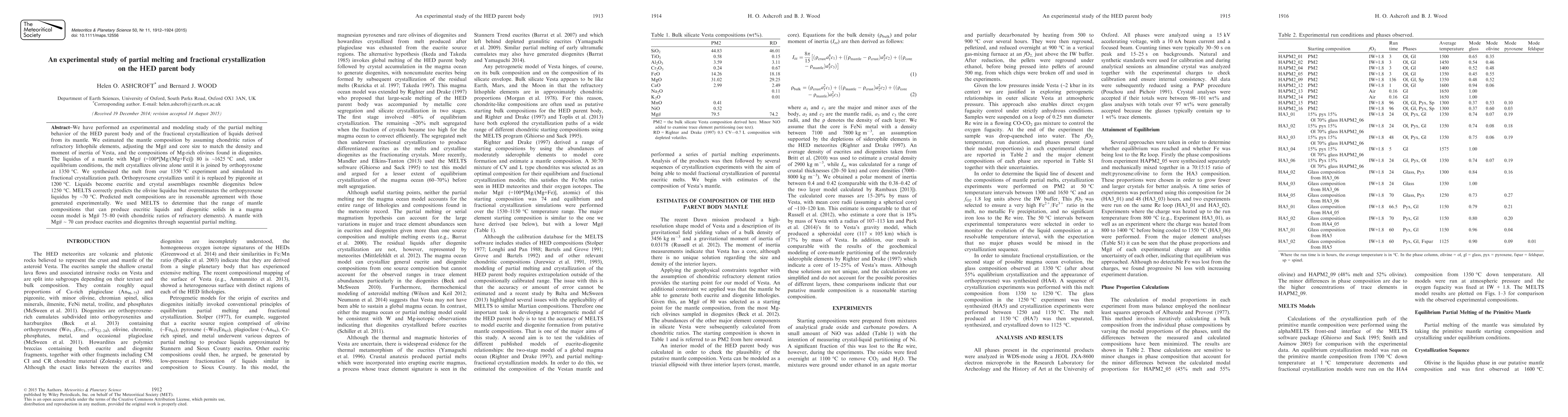 We have performed an experimental and modeling study of the partial melting behavior of the HED parent body and of the fractional crystallization of liquids derived from its mantle. We estimated the mantle composition by assuming chondritic ratios of refractory lithophile elements, adjusting the Mg# and core size to match the density and moment of inertia of Vesta, and the compositions of Mg-rich olivines found in diogenites. The liquidus of a mantle with Mg# (=100*(Mg/(Mg+Fe))) 80 is ~1625oC and, under equilibrium conditions the melt crystallises olivine alone until it is joined by orthopyroxene at 1350oC. We synthesized melt from our 1350oC experiment and simulated its fractional crystallization path. Orthopyroxene crystallizes until it is replaced by pigeonite at 1200oC. Liquids become eucritic and crystal assemblages resemble diogenites below 1250oC. MELTS correctly predicts the olivine liquidus but overestimates the orthopyroxene liquidus by ~70oC. Predicted melt compositions are in reasonable agreement with those generated experimentally. We used MELTS to determine that the range of mantle compositions that can produce eucritic liquids and diogenitic solids in a magma ocean model is Mg# 75-80 (with chondritic ratios of refractory elements). A mantle with Mg# ~ 70 can produce eucrites and diogenites through sequential partial melting.