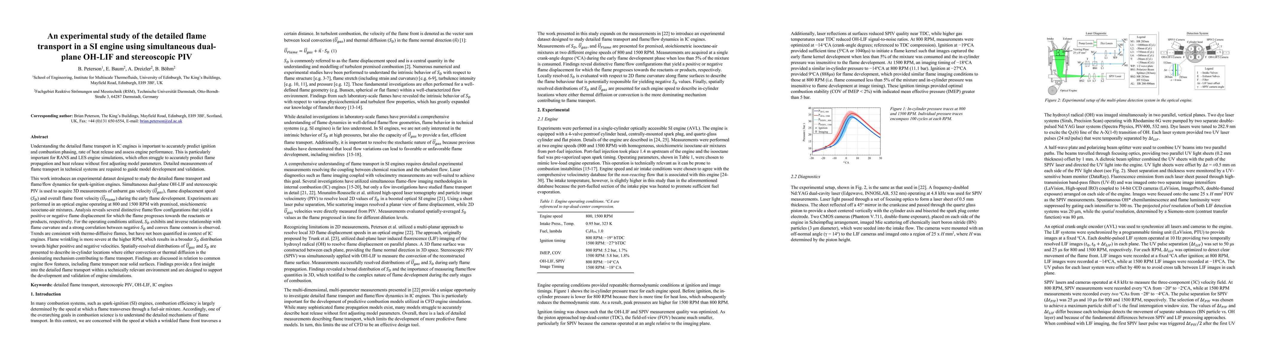 This study employs simultaneous dual-plane OH-LIF and stereoscopic PIV to measure flame transport in a spark-ignition engine, revealing distinct flame/flow configurations and their impact on flame displacement speed. The findings provide insights into the mechanisms of flame propagation and support the validation of engine simulation models.