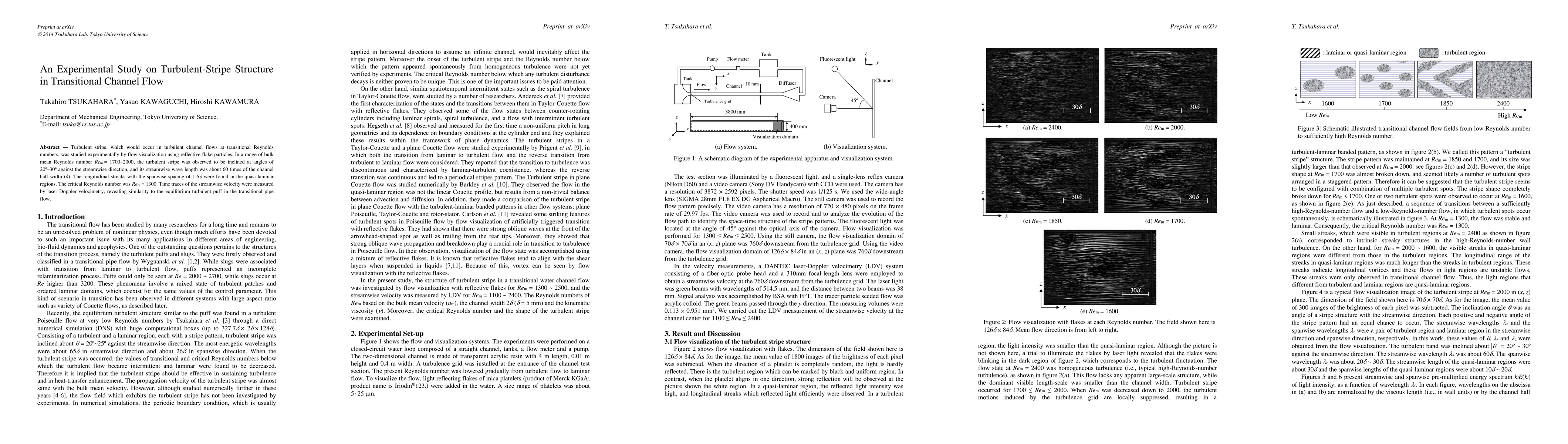This study experimentally investigates turbulent stripes in transitional channel flow using reflective flake particles, observing inclined stripes at 20-30 degrees and a wavelength 60 times the channel half width. The critical Reynolds number for transition was found to be 1300.