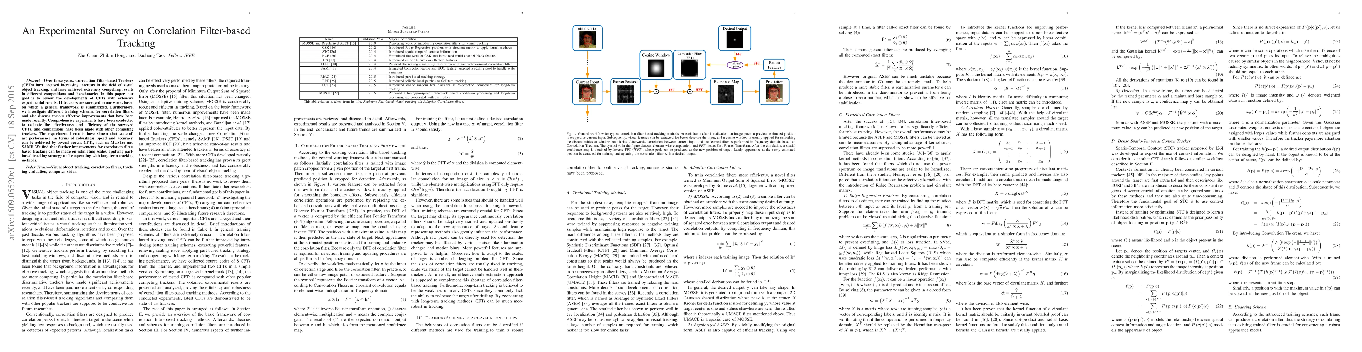 A study reviews 11 Correlation Filter-based Trackers, finding that recent trackers like MUSTer and SAMF achieve state-of-the-art performance in tracking tasks. Further improvements can be made to scale estimation, part-based tracking, and long-term cooperation.