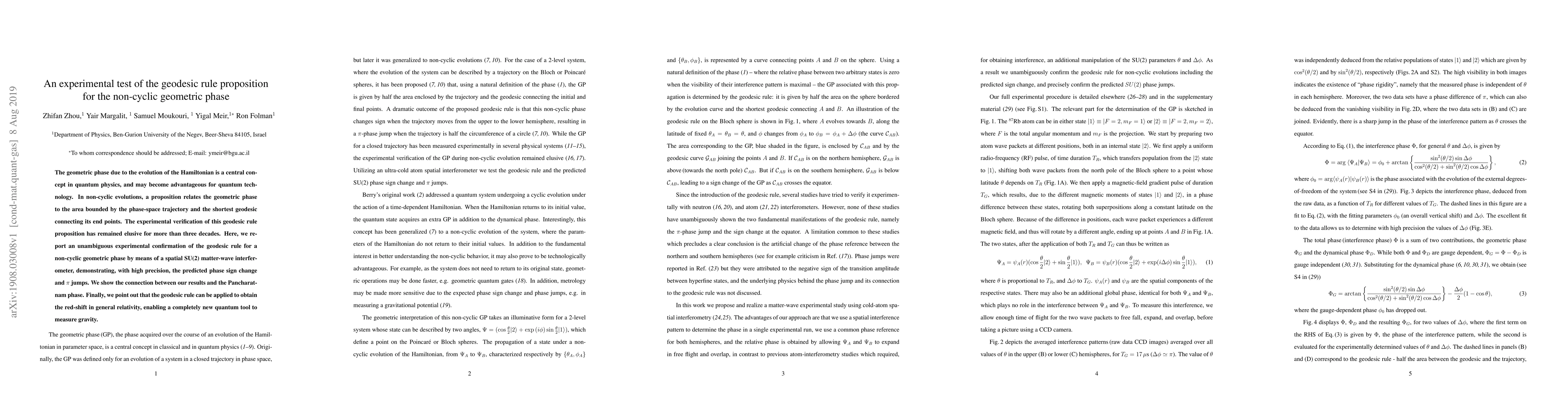 This paper experimentally confirms the geodesic rule proposition for non-cyclic geometric phases using a spatial SU(2) matter-wave interferometer, demonstrating precise phase sign changes and π jumps. The findings also link the geodesic rule to the Pancharatnam phase and suggest its application in measuring gravitational redshift.