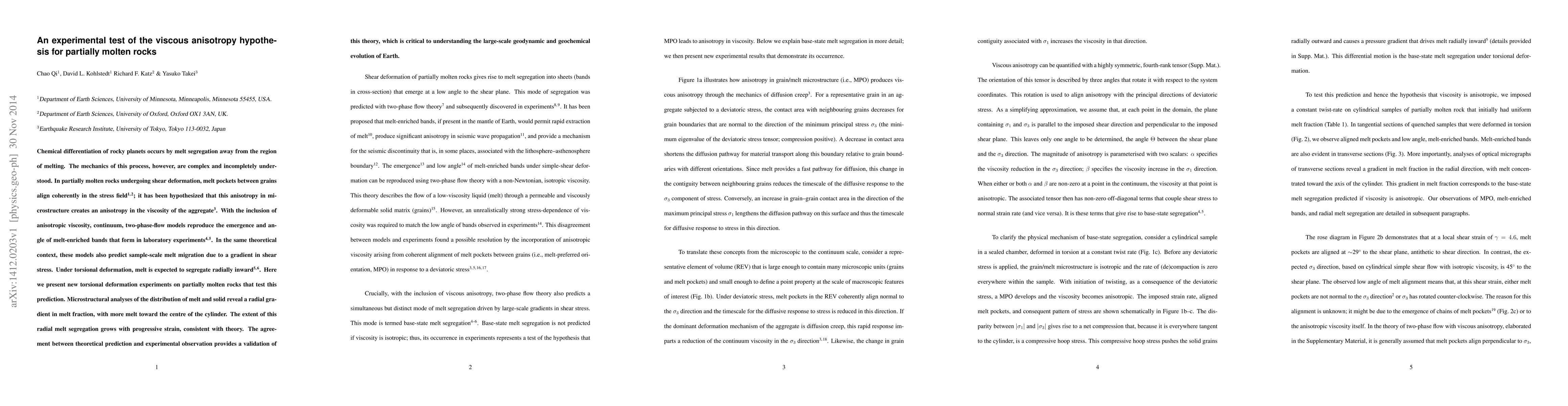 This study experimentally tests the hypothesis of viscous anisotropy in partially molten rocks, finding that melt segregation aligns radially inward under torsional deformation, validating theoretical models and enhancing understanding of planetary differentiation processes.