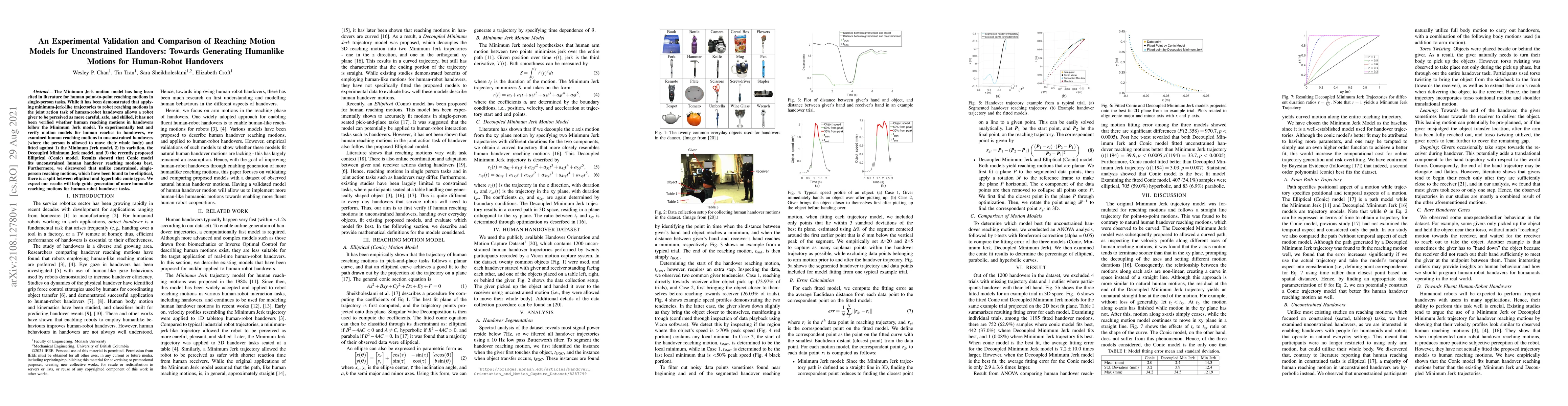 This study experimentally validates and compares three motion models for human reaching motions in unconstrained handovers, finding that the Elliptical (Conic) model best fits these motions. Unlike single-person tasks, unconstrained handovers show a mix of elliptical and hyperbolic conic types, suggesting more nuanced humanlike motion generation for human-robot handovers.
