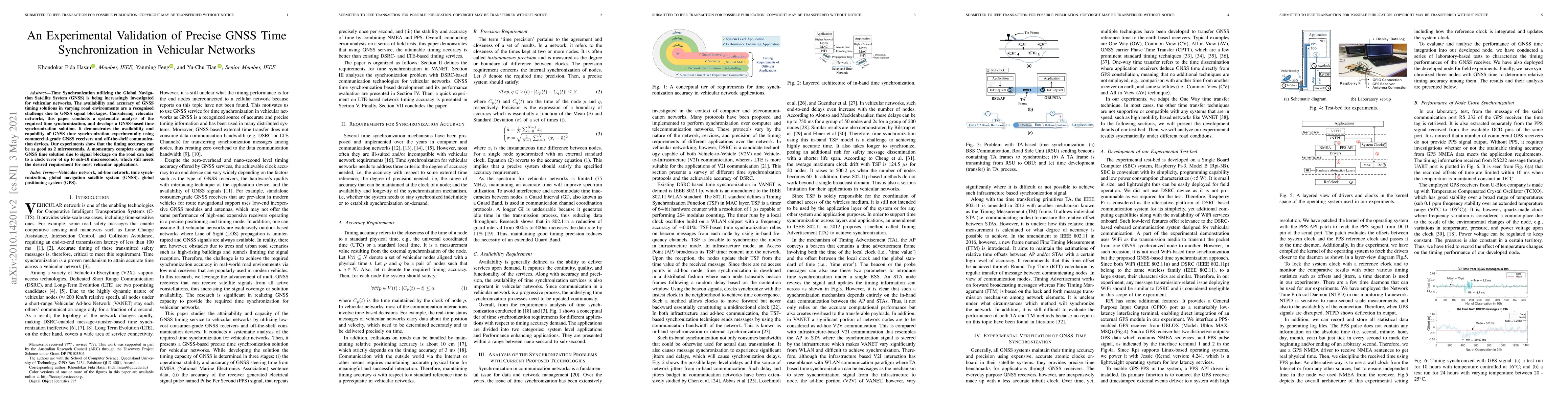 This paper experimentally validates the accuracy of GNSS time synchronization in vehicular networks, demonstrating that commercial-grade GNSS receivers can achieve timing accuracy as good as 2 microseconds. Despite occasional signal blockages, the timing remains sufficiently precise for most vehicular applications.