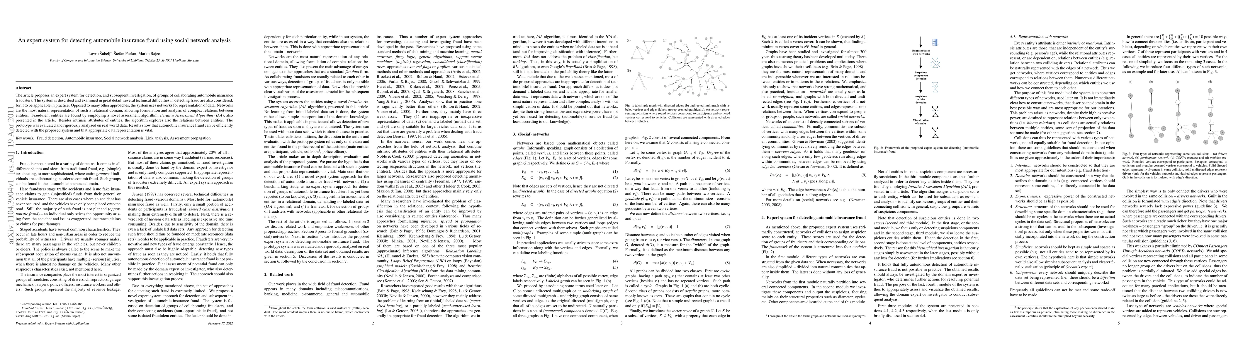 The paper presents an expert system utilizing social network analysis to detect automobile insurance fraud, employing a novel Iterative Assessment Algorithm (IAA) that considers both intrinsic and relational data. The system's effectiveness was validated on real-world data, demonstrating its practical applicability.