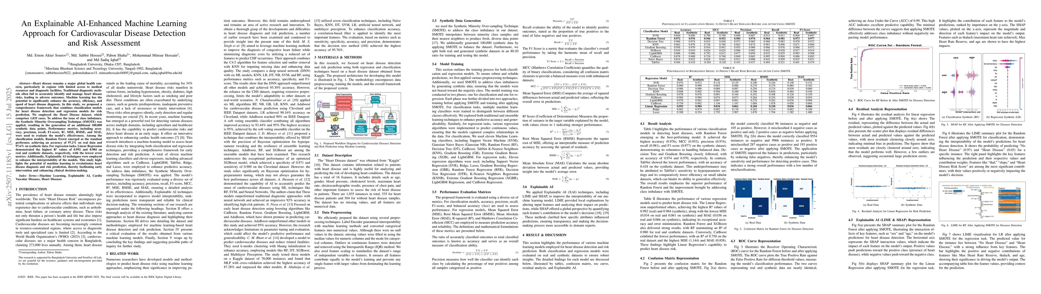 Heart disease remains a major global health concern, particularly in regions with limited access to medical resources and diagnostic facilities. Traditional diagnostic methods often fail to accurately identify and manage heart disease risks, leading to adverse outcomes. Machine learning has the potential to significantly enhance the accuracy, efficiency, and speed of heart disease diagnosis. In this study, we proposed a comprehensive framework that combines classification models for heart disease detection and regression models for risk prediction. We employed the Heart Disease dataset, which comprises 1,035 cases. To address the issue of class imbalance, the Synthetic Minority Oversampling Technique (SMOTE) was applied, resulting in the generation of an additional 100,000 synthetic data points. Performance metrics, including accuracy, precision, recall, F1-score, R2, MSE, RMSE, and MAE, were used to evaluate the model's effectiveness. Among the classification models, Random Forest emerged as the standout performer, achieving an accuracy of 97.2% on real data and 97.6% on synthetic data. For regression tasks, Linear Regression demonstrated the highest R2 values of 0.992 and 0.984 on real and synthetic datasets, respectively, with the lowest error metrics. Additionally, Explainable AI techniques were employed to enhance the interpretability of the models. This study highlights the potential of machine learning to revolutionize heart disease diagnosis and risk prediction, thereby facilitating early intervention and enhancing clinical decision-making.