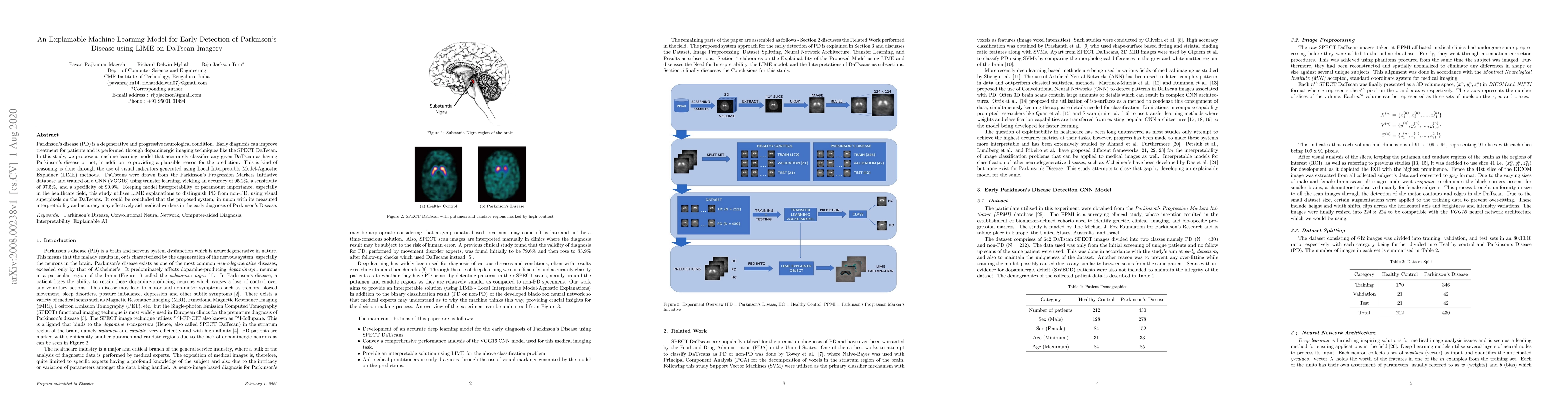 Parkinson's disease (PD) is a degenerative and progressive neurological condition. Early diagnosis can improve treatment for patients and is performed through dopaminergic imaging techniques like the SPECT DaTscan. In this study, we propose a machine learning model that accurately classifies any given DaTscan as having Parkinson's disease or not, in addition to providing a plausible reason for the prediction. This is kind of reasoning is done through the use of visual indicators generated using Local Interpretable Model-Agnostic Explainer (LIME) methods. DaTscans were drawn from the Parkinson's Progression Markers Initiative database and trained on a CNN (VGG16) using transfer learning, yielding an accuracy of 95.2%, a sensitivity of 97.5%, and a specificity of 90.9%. Keeping model interpretability of paramount importance, especially in the healthcare field, this study utilises LIME explanations to distinguish PD from non-PD, using visual superpixels on the DaTscans. It could be concluded that the proposed system, in union with its measured interpretability and accuracy may effectively aid medical workers in the early diagnosis of Parkinson's Disease.