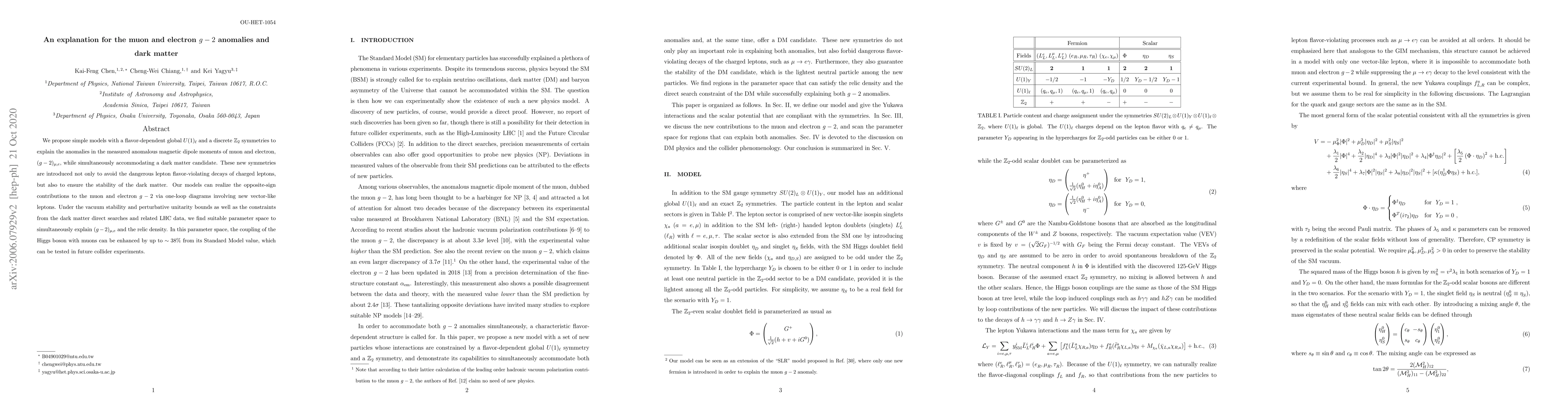 We propose simple models with a flavor-dependent global $U(1)_\ell$ and a discrete $\mathbb{Z}_2$ symmetries to explain the anomalies in the measured anomalous magnetic dipole moments of muon and electron, $(g-2)_{\mu,e}$, while simultaneously accommodating a dark matter candidate. These new symmetries are introduced not only to avoid the dangerous lepton flavor-violating decays of charged leptons, but also to ensure the stability of the dark matter. Our models can realize the opposite-sign contributions to the muon and electron $g-2$ via one-loop diagrams involving new vector-like leptons. Under the vacuum stability and perturbative unitarity bounds as well as the constraints from the dark matter direct searches and related LHC data, we find suitable parameter space to simultaneously explain $(g-2)_{\mu,e}$ and the relic density. In this parameter space, the coupling of the Higgs boson with muons can be enhanced by up to $\sim 38\%$ from its Standard Model value, which can be tested in future collider experiments.
