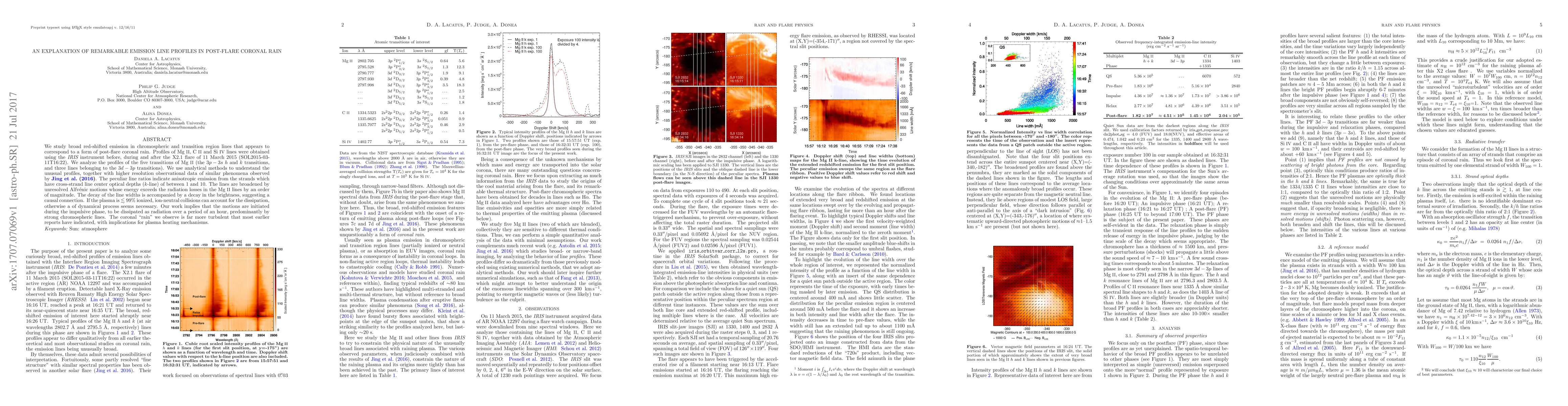 We study broad red-shifted emission in chromospheric and transition region lines that appears to correspond to a form of post-flare coronal rain. Profiles of Mg II, C II and Si IV lines were obtained using the IRIS instrument before, during and after the X2.1 flare of 11 March 2015 (SOL2015-03- 11T16:22). We analyze the profiles of the five transitions of Mg II (the 3p - 3s h and k transitions, and three lines belonging to the 3d - 3p transitions). We use analytical methods to understand the unusual profiles, together with higher resolution observational data of similar phenomena observed by Jing et al. (2016). The peculiar line ratios indicate anisotropic emission from the strands which have cross-strand line center optical depths (k-line) of between 1 and 10. The lines are broadened by unresolved Alfvenic motions whose energy exceeds the radiation losses in the Mg II lines by an order of magnitude. The decay of the line widths is accompanied by a decay in the brightness, suggesting a causal connection. If the plasma is <~ 99% ionized, ion-neutral collisions can account for the dissipation, otherwise a of dynamical process seems necessary. Our work implies that the motions are initiated during the impulsive phase, to be dissipated as radiation over a period of an hour, predominantly by strong chromospheric lines. The coronal "rain" we observe is far more turbulent that most earlier reports have indicated, with implications for plasma heating mechanisms.