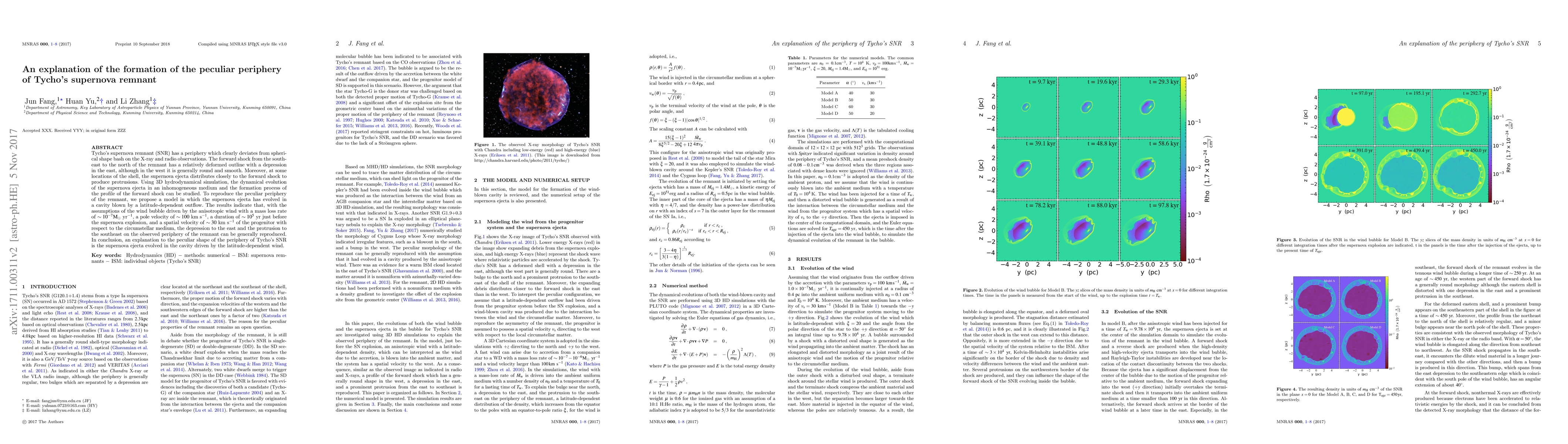 This paper explains the formation of Tycho's supernova remnant's peculiar periphery through 3D hydrodynamical simulations. It proposes a model where the ejecta evolved in a cavity driven by a latitude-dependent outflow, reproducing the observed deformations, including the east depression and southeast protrusion.