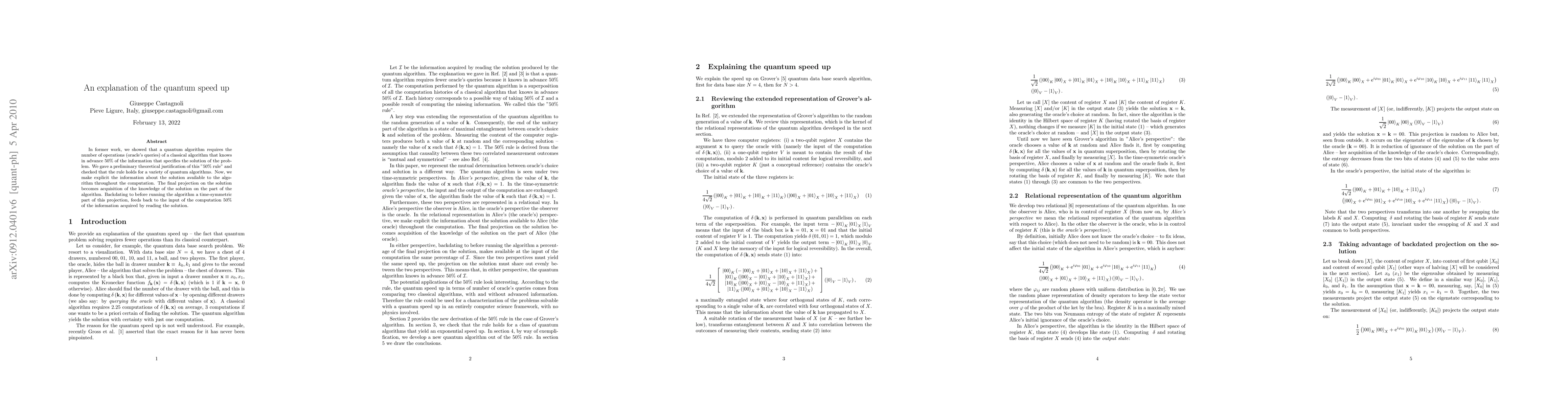 In former work, we showed that a quantum algorithm requires the number of operations (oracle's queries) of a classical algorithm that knows in advance 50% of the information that specifies the solution of the problem. We gave a preliminary theoretical justification of this "50% rule" and checked that the rule holds for a variety of quantum algorithms. Now, we make explicit the information about the solution available to the algorithm throughout the computation. The final projection on the solution becomes acquisition of the knowledge of the solution on the part of the algorithm. Backdating to before running the algorithm a time-symmetric part of this projection, feeds back to the input of the computation 50% of the information acquired by reading the solution.