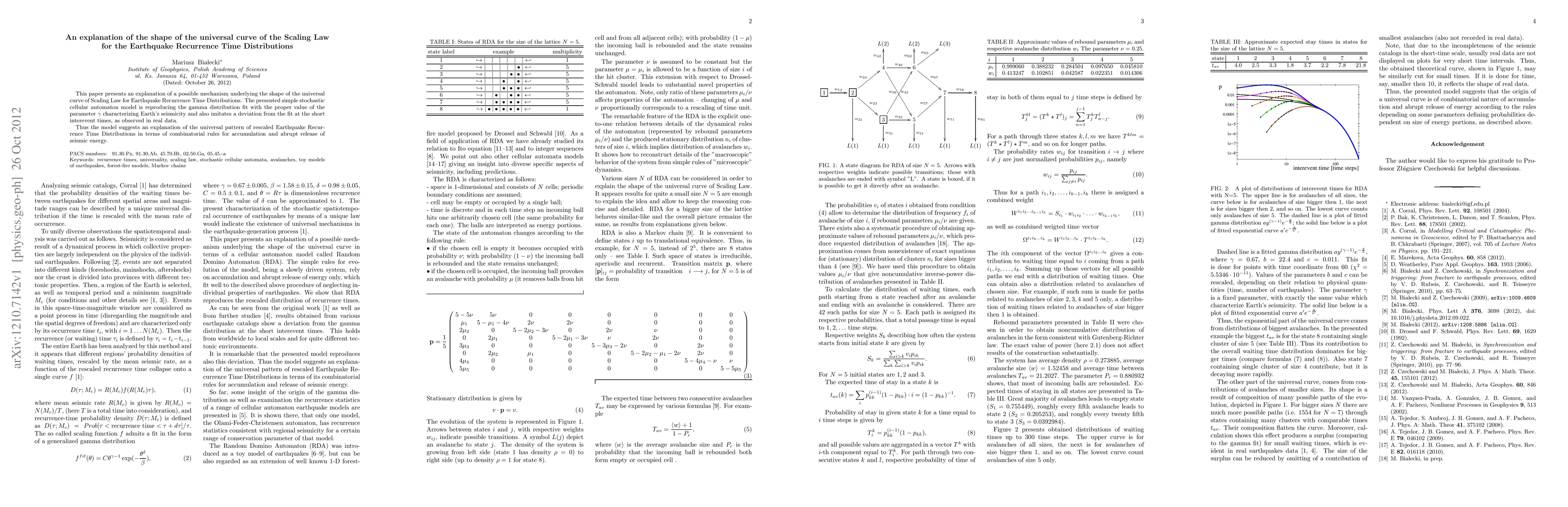 This paper proposes a stochastic cellular automaton model to explain the universal curve of the Scaling Law for Earthquake Recurrence Time Distributions, showing it reproduces the gamma distribution and accounts for deviations at short interevent times, suggesting a combinatorial mechanism for seismic energy accumulation and release.