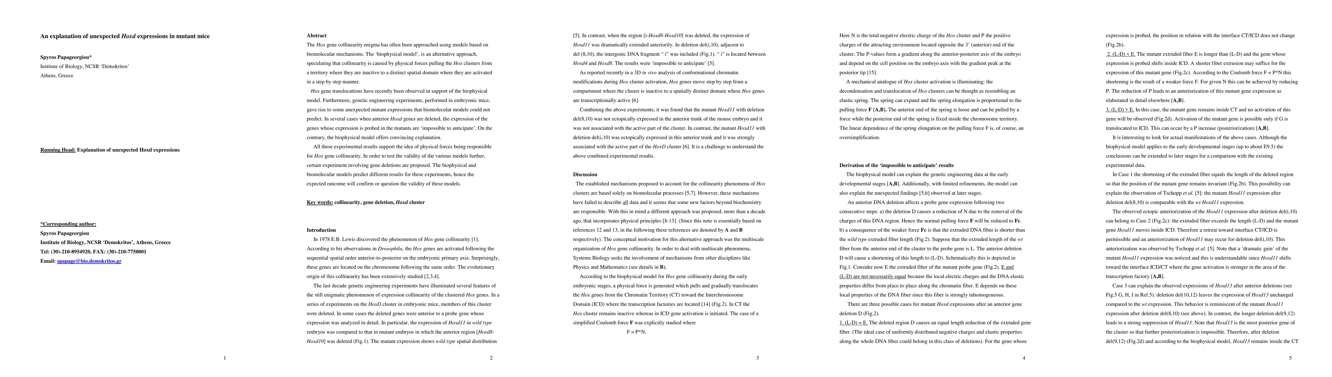 This paper explores the Hox gene collinearity enigma through a biophysical model, suggesting physical forces drive Hox gene activation. Unexpected mutant expressions in genetically engineered mice support this model over traditional biomolecular approaches, proposing further experiments to validate the biophysical model.