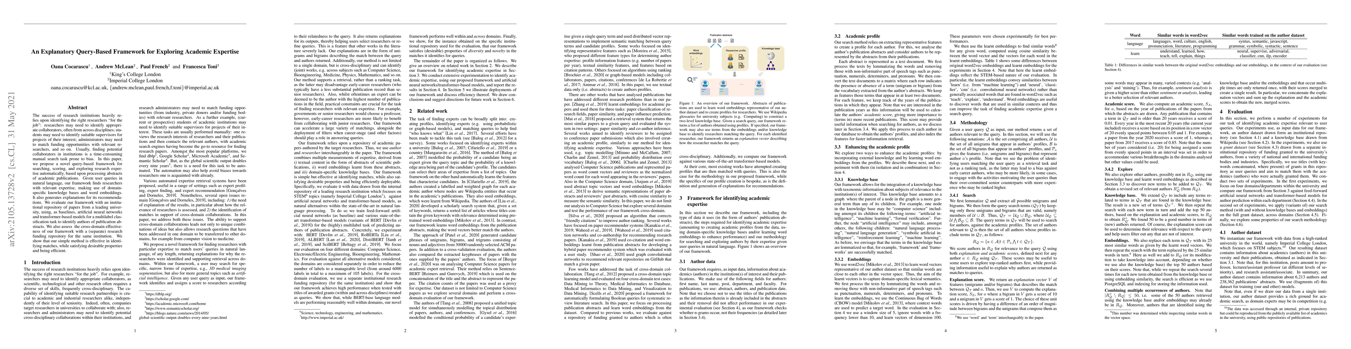 The success of research institutions heavily relies upon identifying the right researchers "for the job": researchers may need to identify appropriate collaborators, often from across disciplines; students may need to identify suitable supervisors for projects of their interest; administrators may need to match funding opportunities with relevant researchers, and so on. Usually, finding potential collaborators in institutions is a time-consuming manual search task prone to bias. In this paper, we propose a novel query-based framework for searching, scoring, and exploring research expertise automatically, based upon processing abstracts of academic publications. Given user queries in natural language, our framework finds researchers with relevant expertise, making use of domain-specific knowledge bases and word embeddings. It also generates explanations for its recommendations. We evaluate our framework with an institutional repository of papers from a leading university, using, as baselines, artificial neural networks and transformer-based models for a multilabel classification task to identify authors of publication abstracts. We also assess the cross-domain effectiveness of our framework with a (separate) research funding repository for the same institution. We show that our simple method is effective in identifying matches, while satisfying desirable properties and being efficient.