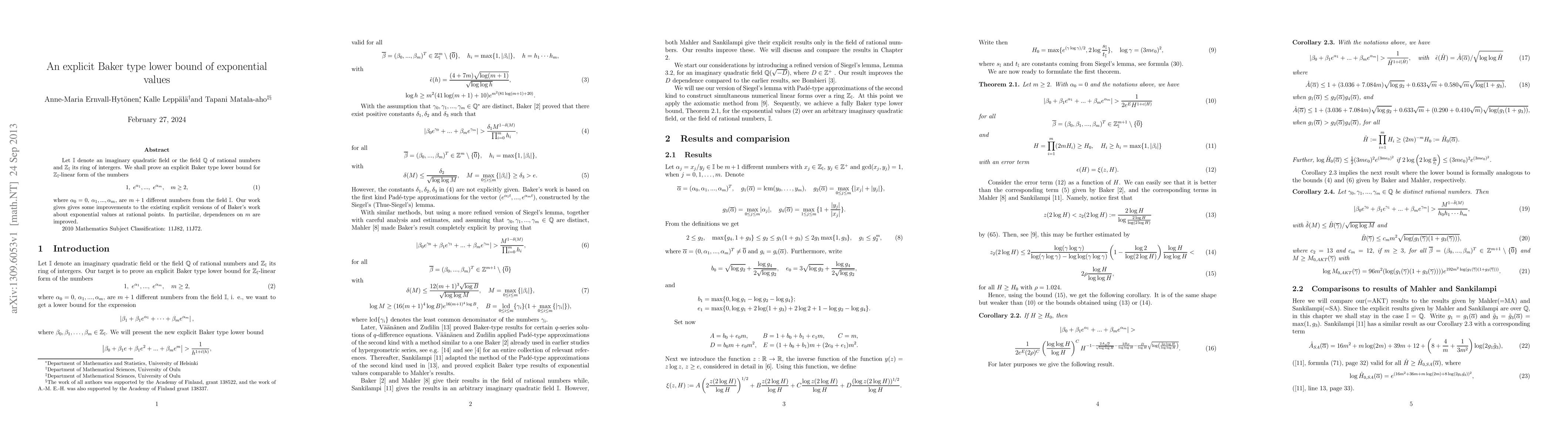 Let $\mathbb{I}$ denote an imaginary quadratic field or the field $\mathbb{Q}$ of rational numbers and $\mathbb{Z}_{\mathbb{I}}$ its ring of intergers. We shall prove an explicit Baker type lower bound for $\mathbb{Z}_{\mathbb{I}}$-linear form of the numbers \begin{equation}\label{1} 1,\ e^{\alpha_1},...,\ e^{\alpha_m},\quad m\ge 2, \end{equation} where $\alpha_0=0$, $\alpha_1,...,\alpha_m$, are $m+1$ different numbers from the field $\mathbb{I}$. Our work gives gives some improvements to the existing explicit versions of of Baker's work about exponential values at rational points. In particilar, dependences on $m$ are improved.