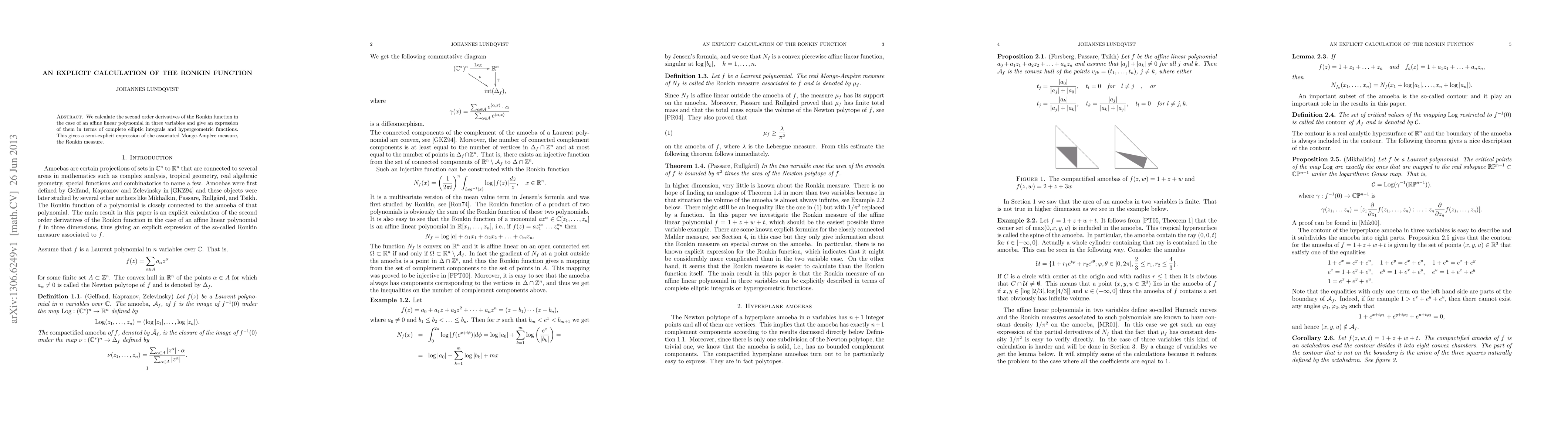 The paper explicitly calculates the second-order derivatives of the Ronkin function for an affine linear polynomial in three variables, expressing them in terms of complete elliptic integrals and hypergeometric functions.