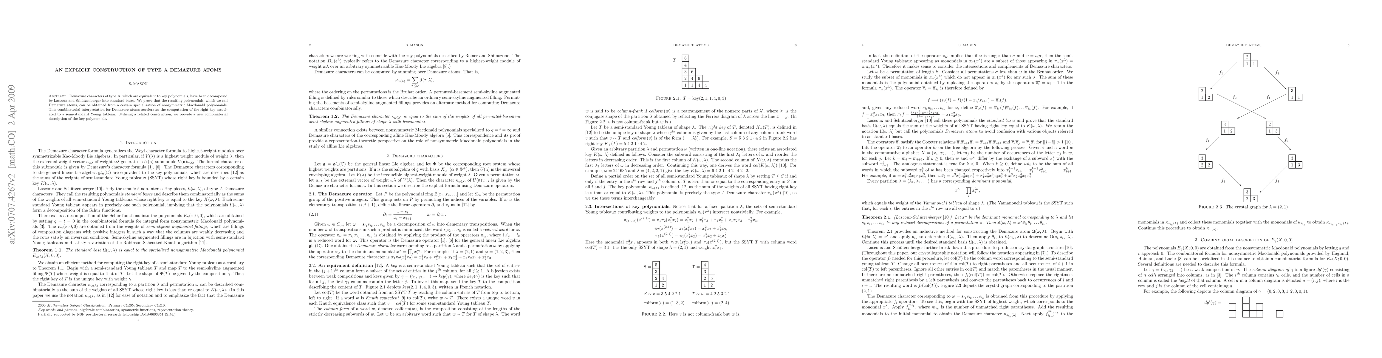 Demazure characters of type A, which are equivalent to key polynomials, have been decomposed by Lascoux and Sch\"{u}tzenberger into standard bases. We prove that the resulting polynomials, which we call Demazure atoms, can be obtained from a certain specialization of nonsymmetric Macdonald polynomials. This combinatorial interpretation for Demazure atoms accelerates the computation of the right key associated to a semi-standard Young tableau. Utilizing a related construction, we provide a new combinatorial description for the key polynomials.