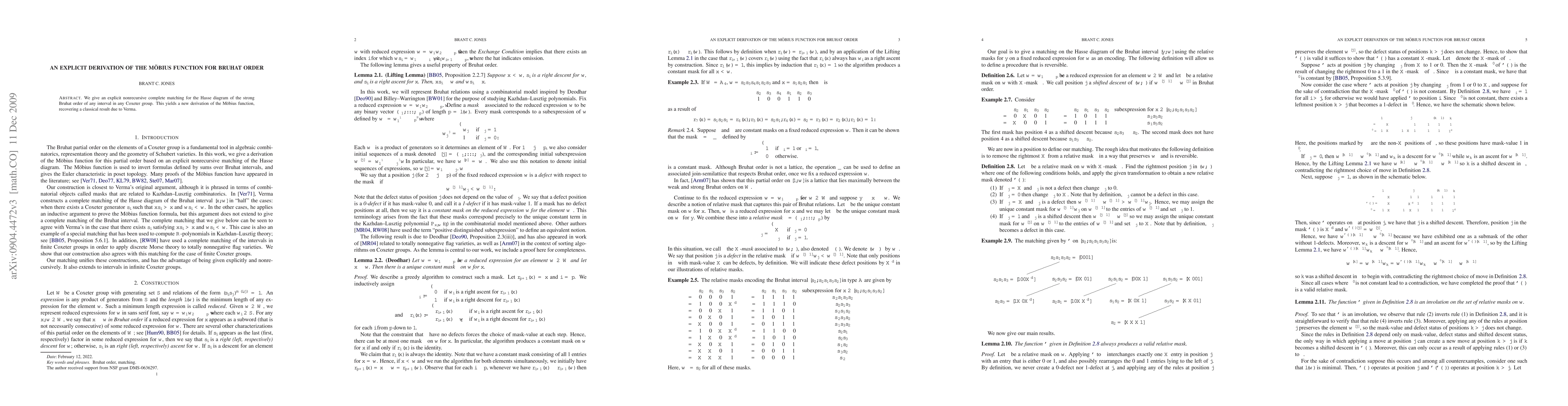 We give an explicit nonrecursive complete matching for the Hasse diagram of the strong Bruhat order of any interval in any Coxeter group. This yields a new derivation of the Mobius function, recovering a classical result due to Verma.
