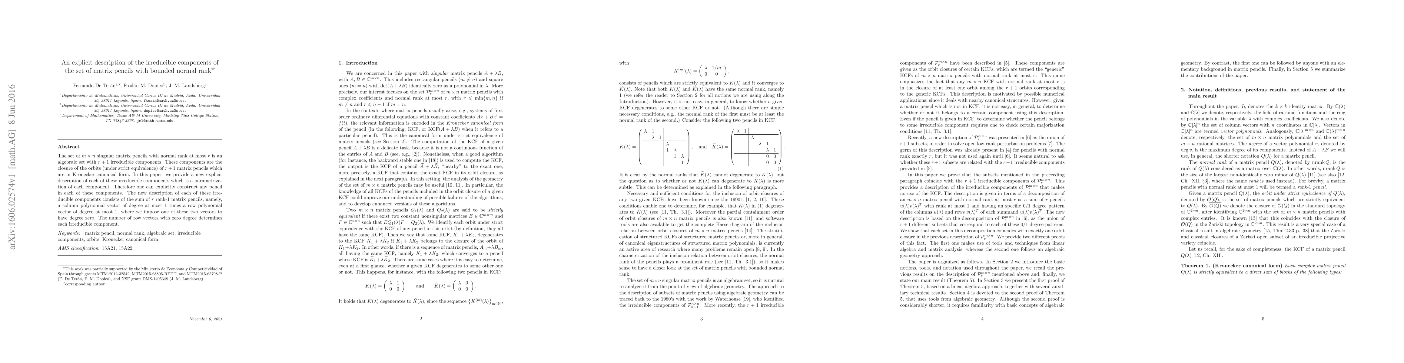 The set of mxn singular matrix pencils with normal rank at most r is an algebraic set with r+1 irreducible components. These components are the closure of the orbits (under strict equivalence) of r+1 matrix pencils which are in Kronecker canonical form. In this paper, we provide a new explicit description of each of these irreducible components which is a parametrization of each component. Therefore one can explicitly construct any pencil in each of these components. The new description of each of these irreducible components consists of the sum of r rank-1 matrix pencils, namely, a column polynomial vector of degree at most 1 times a row polynomial vector of degree at most 1, where we impose one of these two vectors to have degree zero. The number of row vectors with zero degree determines each irreducible component.