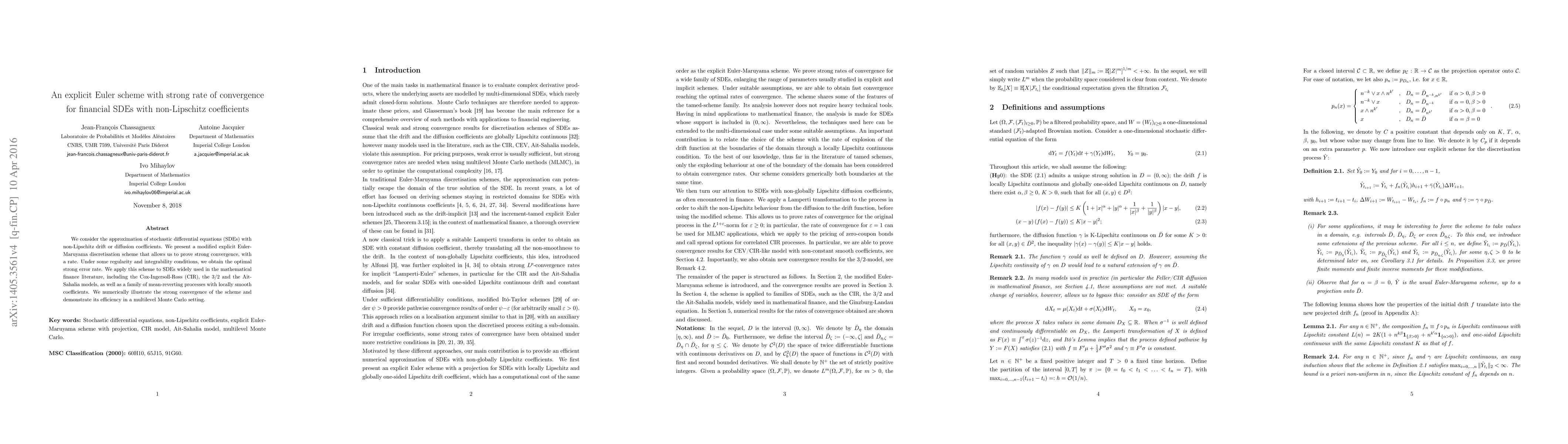 This paper proposes a modified explicit Euler-Maruyama scheme for approximating stochastic differential equations with non-Lipschitz coefficients, proving strong convergence with an optimal rate under certain conditions. The scheme is applied to several financial models and shown to be efficient in multilevel Monte Carlo simulations.