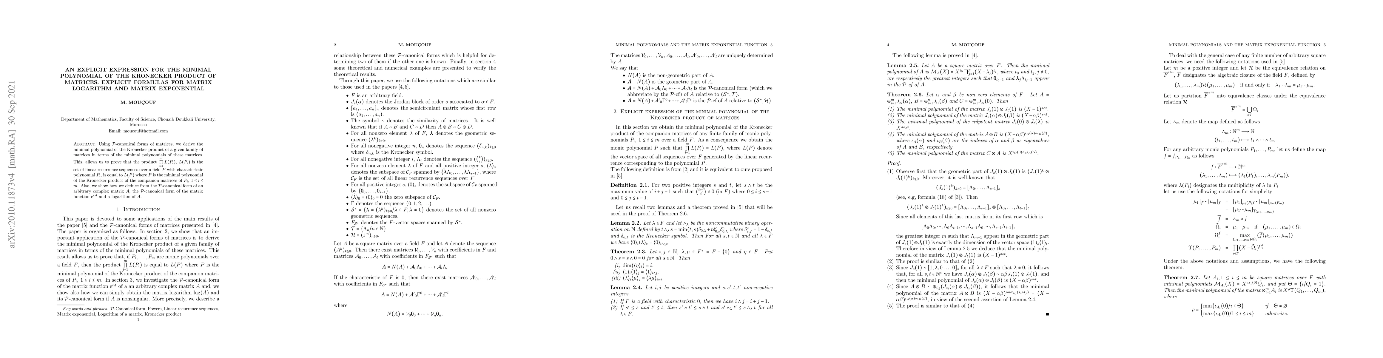 Using $\mathcal{P}$-canonical forms of matrices, we derive the minimal polynomial of the Kronecker product of a given family of matrices in terms of the minimal polynomials of these matrices. This, allows us to prove that the product $\prod\limits_{i=1}^{m}L(P_{i})$, $L(P_{i})$ is the set of linear recurrence sequences over a field $F$ with characteristic polynomial $P_{i}$, is equal to $L(P)$ where $P$ is the minimal polynomial of the Kronecker product of the companion matrices of $P_{i}$, $1\leq i\leq m$. Also, we show how we deduce from the $\mathcal{P}$-canonical form of an arbitrary complex matrix $A$, the $\mathcal{P}$-canonical form of the matrix function $e^{tA}$ and a logarithm of $A$.