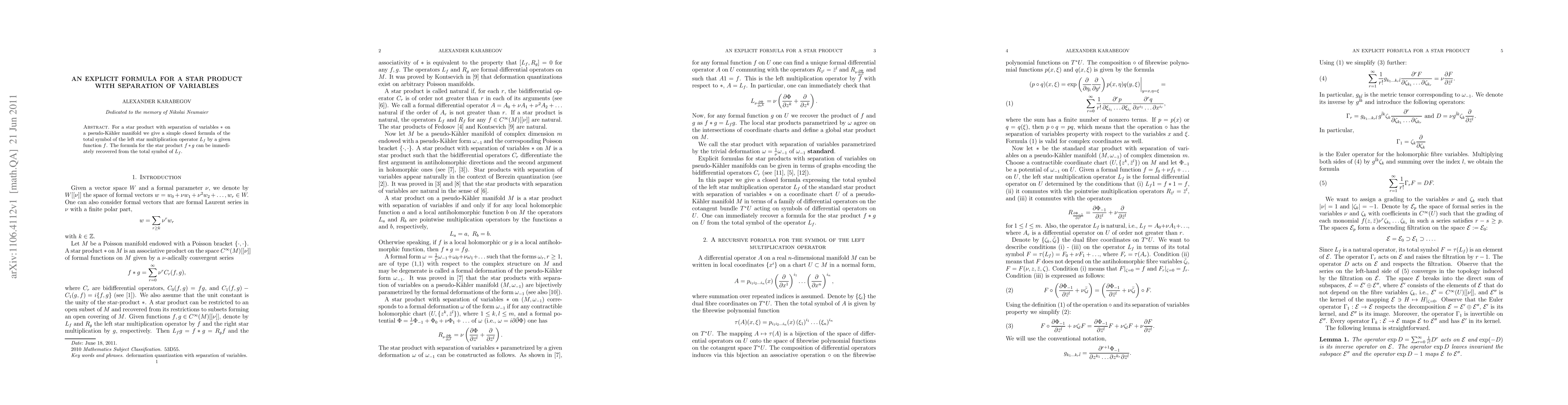 For a star product with separation of variables * on a pseudo-Kaehler manifold we give a simple closed formula of the total symbol of the left star multiplication operator L_f by a given function f. The formula for the star product f * g can be immediately recovered from the total symbol of L_f.