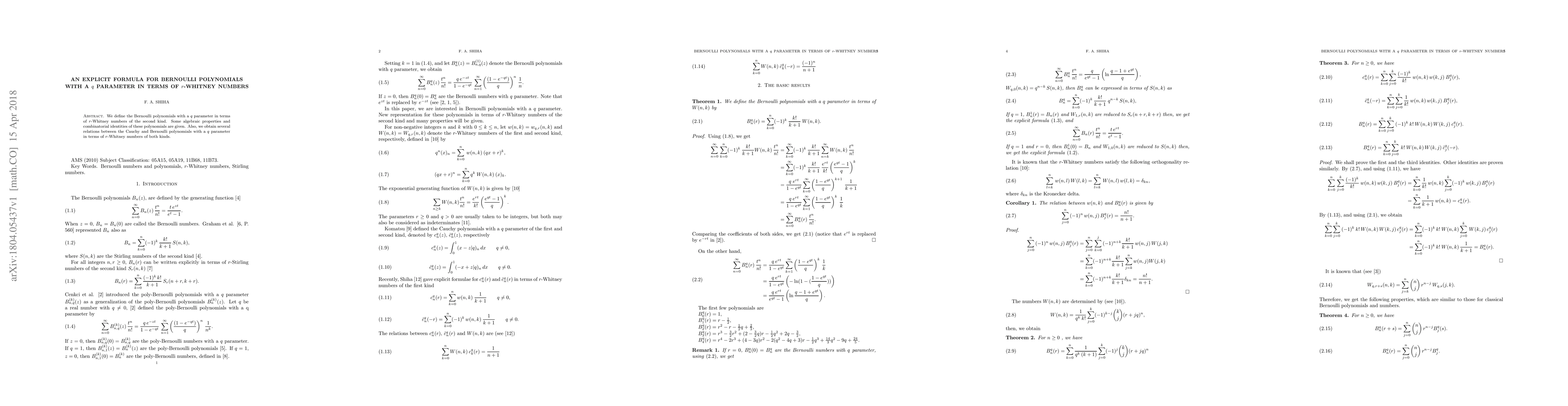 We define the Bernoulli polynomials with a $q$ parameter in terms of $r$-Whitney numbers of the second kind. Some algebraic properties and combinatorial identities of these polynomials are given. Also, we obtain several relations between the Cauchy and Bernoulli polynomials with a $q$ parameter in terms of $r$-Whitney numbers of both kinds.