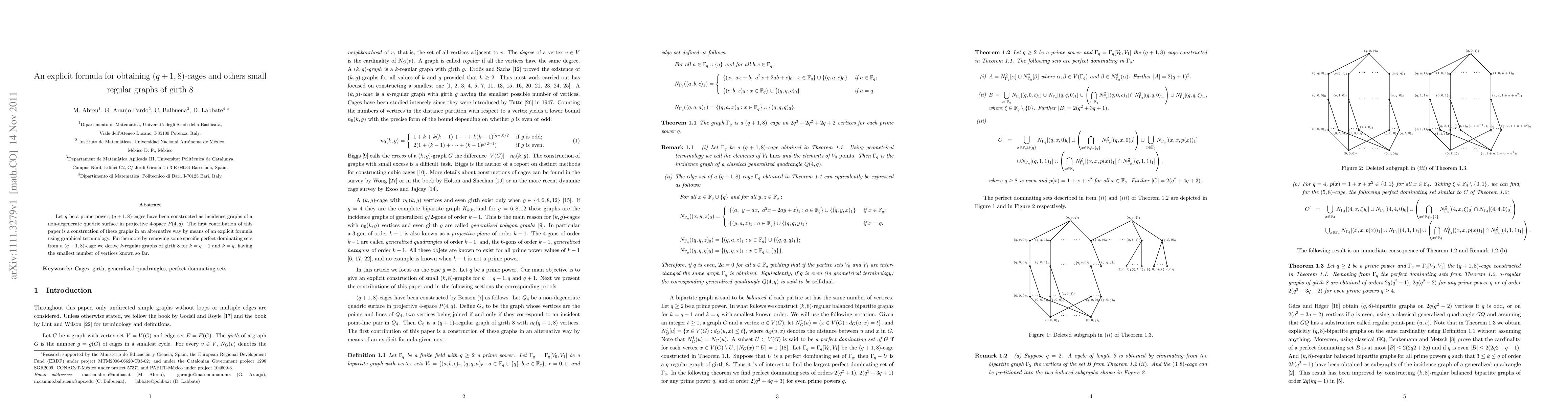 Let $q$ be a prime power; $(q+1,8)$-cages have been constructed as incidence graphs of a non-degenerate quadric surface in projective 4-space $P(4, q)$. The first contribution of this paper is a construction of these graphs in an alternative way by means of an explicit formula using graphical terminology. Furthermore by removing some specific perfect dominating sets from a $(q+1,8)$-cage we derive $k$-regular graphs of girth 8 for $k= q-1$ and $k=q$, having the smallest number of vertices known so far.