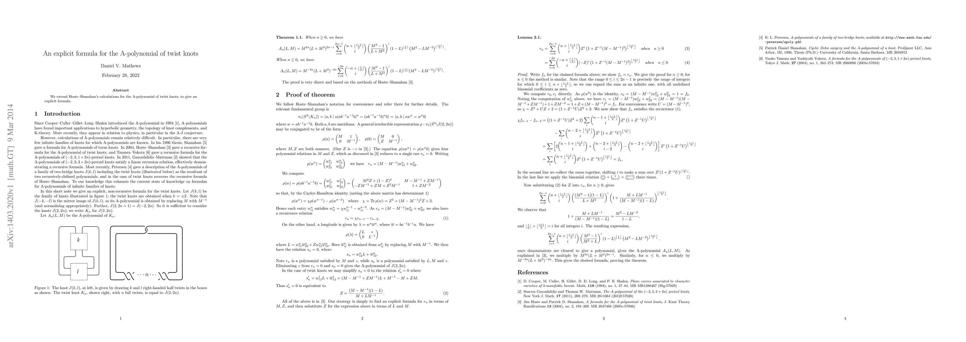 Summary: This paper provides an explicit formula for the A-polynomial of twist knots, building on the foundational work of Hoste-Shanahan to extend their calculations. The formula offers a new perspective on the mathematical structure of twist knots.