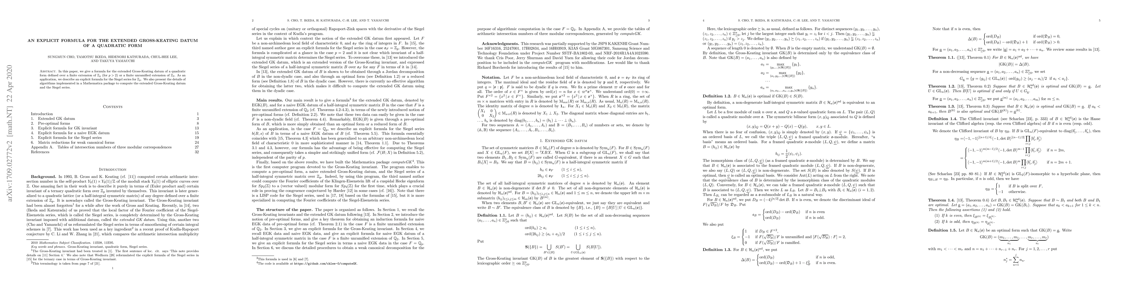 In this paper, we give a formula for the extended Gross-Keating datum of a quadratic form defined over a finite extension of $\mathbb{Z}_p$ (for $p>2$) or a finite unramified extension of $\mathbb{Z}_2$. As an application, we describe an explicit formula for the Siegel series for $\mathbb{Z}_p$. We also present the details of algorithms implemented in a Mathematica package to compute the extended Gross-Keating datum and the Siegel series.