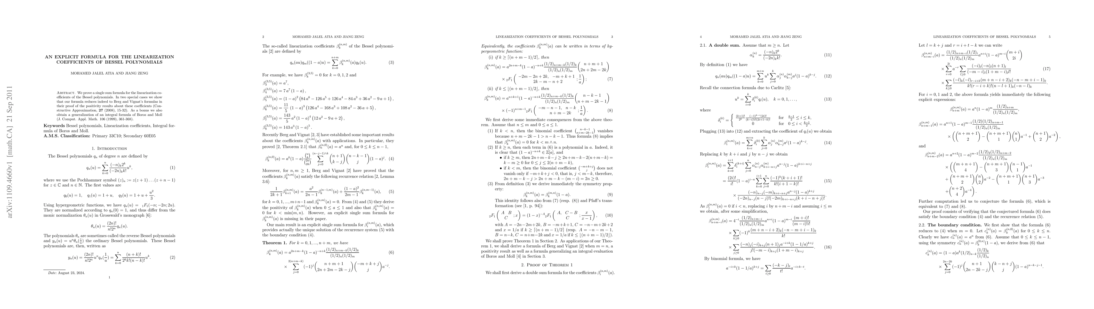 This paper presents a new explicit formula for the linearization coefficients of Bessel polynomials and shows its equivalence to existing results by Berg and Vignat. Additionally, it generalizes an integral formula from Boros and Moll.