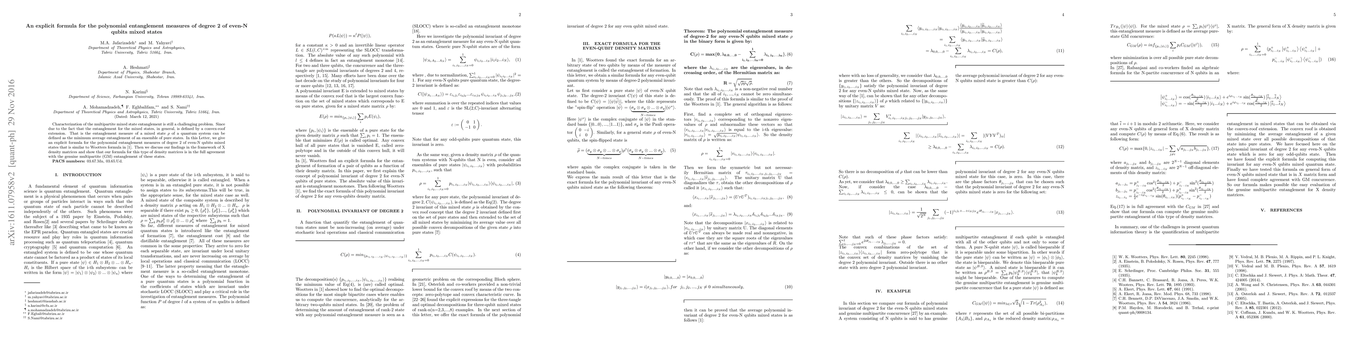 Characterization of the multipartite mixed state entanglement is still a challenging problem. Since due to the fact that the entanglement for the mixed states, in general, is defined by a convex-roof extension. That is the entanglement measure of a mixed state \r{ho} of a quantum system can be defined as the minimum average entanglement of an ensemble of pure states. In this Letter, we give an explicit formula for the polynomial entanglement measures of degree 2 of even-N qubits mixed states that is similar to Wooters formula in [1]. Then we discuss our findings in the framework of X density matrices and show that our formula for this type of density matrices is in the full agreement with the genuine multipartite (GM) entanglement of these states.