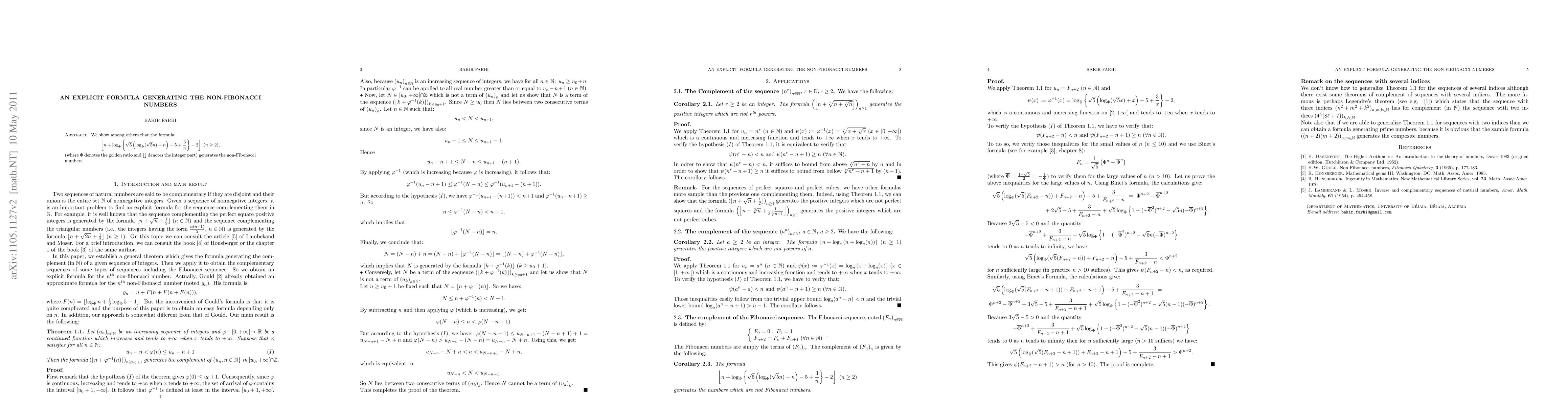 We show among others that the formula: $$ \lfloor n + \log_{\Phi}\{\sqrt{5}(\log_{\Phi}(\sqrt{5}n) + n) -5 + \frac{3}{n}\} - 2 \rfloor (n \geq 2), $$ (where $\Phi$ denotes the golden ratio and $\lfloor \rfloor$ denotes the integer part) generates the non-Fibonacci numbers.