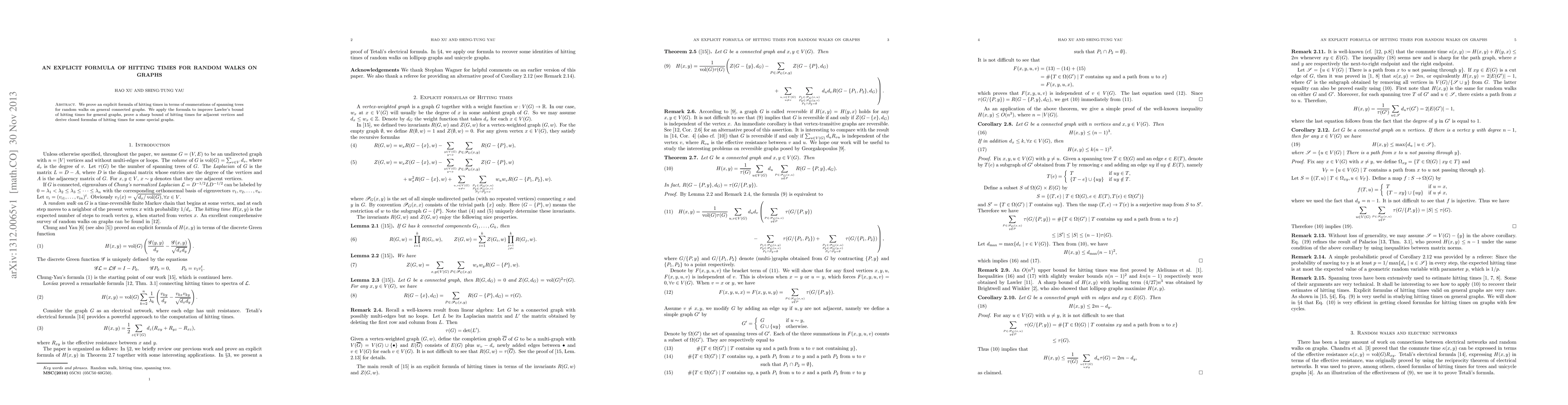 This paper presents an explicit formula for hitting times in random walks on connected graphs, derived from spanning tree enumerations, and uses it to refine existing bounds, establish sharp bounds for adjacent vertices, and provide closed formulas for specific graph types.