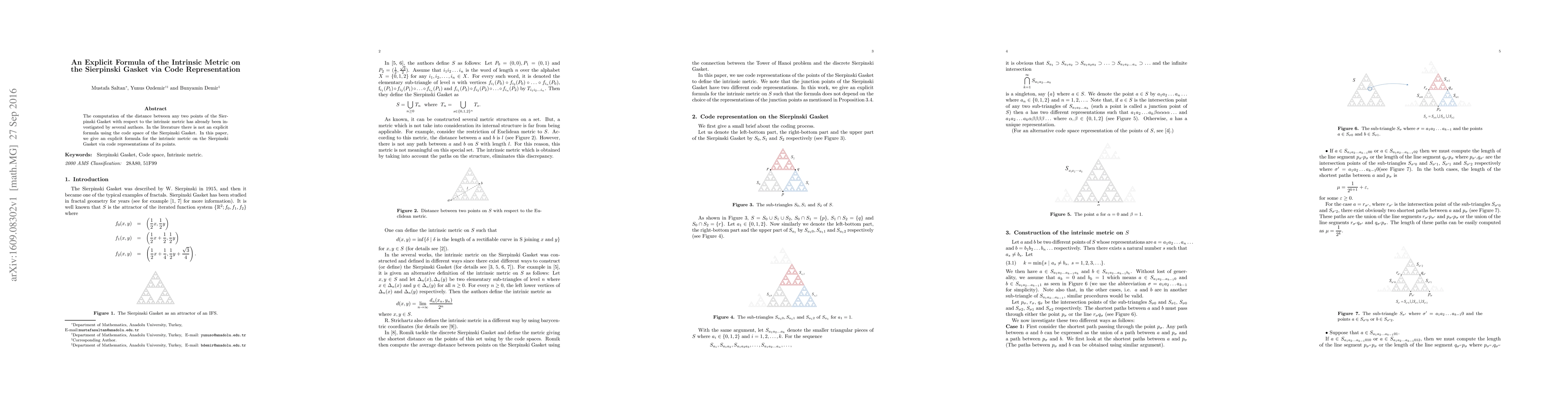 The computation of the distance between any two points of the Sierpinski Gasket with respect to the intrinsic metric has already been investigated by several authors. In the literature there is not an explicit formula using the code space of the Sierpinski Gasket. In this paper, we give an explicit formula for the intrinsic metric on the Sierpinski Gasket via code representations of its points.