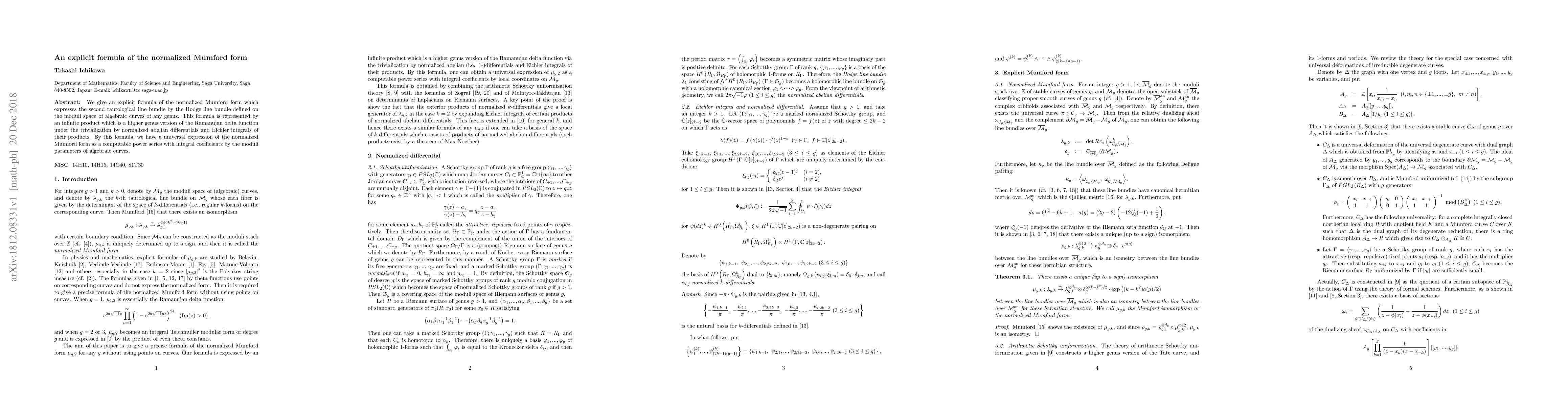 This paper presents an explicit formula for the normalized Mumford form, representing the second tautological line bundle using the Hodge line bundle on moduli spaces of algebraic curves. The formula is given as an infinite product, akin to the Ramanujan delta function, providing a computable power series expression with integral coefficients linked to moduli parameters.