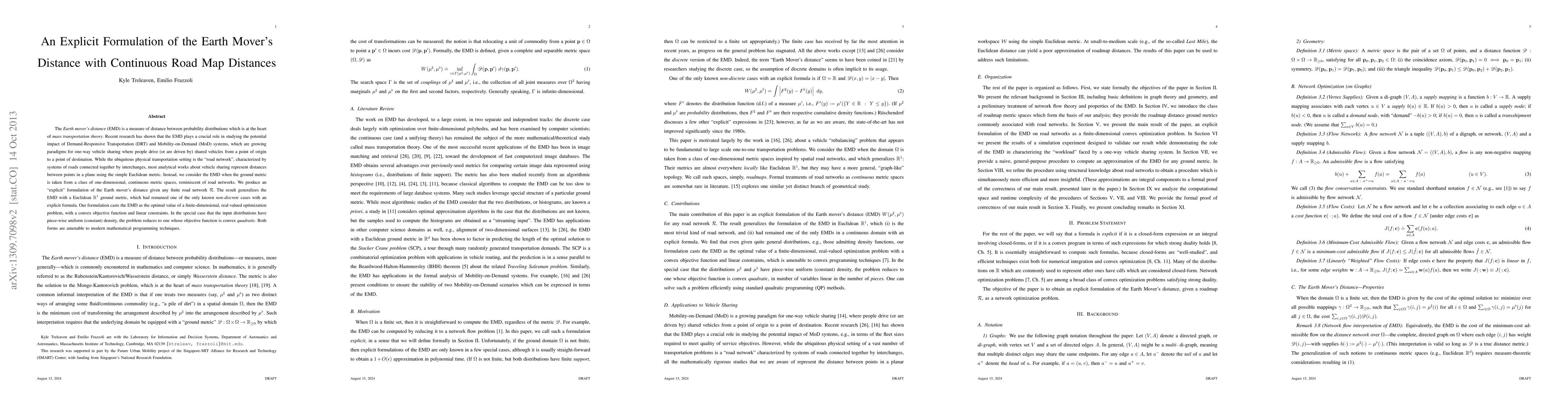 The Earth movers distance (EMD) is a measure of distance between probability distributions which is at the heart of mass transportation theory. Recent research has shown that the EMD plays a crucial role in studying the potential impact of Demand-Responsive Transportation (DRT) and Mobility-on-Demand (MoD) systems, which are growing paradigms for one-way vehicle sharing where people drive (or are driven by) shared vehicles from a point of origin to a point of destination. While the ubiquitous physical transportation setting is the road network, characterized by systems of roads connected together by interchanges, most analytical works about vehicle sharing represent distances between points in a plane using the simple Euclidean metric. Instead, we consider the EMD when the ground metric is taken from a class of one-dimensional, continuous metric spaces, reminiscent of road networks. We produce an explicit formulation of the Earth movers distance given any finite road network R. The result generalizes the EMD with a Euclidean R1 ground metric, which had remained one of the only known non-discrete cases with an explicit formula. Our formulation casts the EMD as the optimal value of a finite-dimensional, real-valued optimization problem, with a convex objective function and linear constraints. In the special case that the input distributions have piece-wise uniform (constant) density, the problem reduces to one whose objective function is convex quadratic. Both forms are amenable to modern mathematical programming techniques.