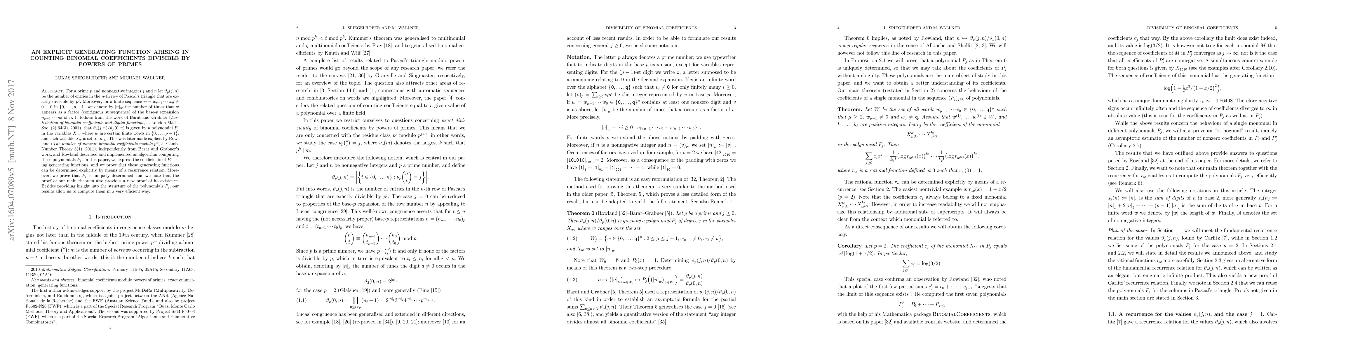 For a prime $p$ and nonnegative integers $j$ and $n$ let $\vartheta_p(j,n)$ be the number of entries in the $n$-th row of Pascal's triangle that are exactly divisible by $p^j$. Moreover, for a finite sequence $w=(w_{r-1}\cdots w_0)\neq (0,\ldots,0)$ in $\{0,\ldots,p-1\}$ we denote by $\lvert n\rvert_w$ the number of times that $w$ appears as a factor (contiguous subsequence) of the base-$p$ expansion $n=(n_{\mu-1}\cdots n_0)_p$ of $n$. It follows from the work of Barat and Grabner (Digital functions and distribution of binomial coefficients, J. London Math. Soc. (2) 64(3), 2001), that $\vartheta_p(j,n)/\vartheta_p(0,n)$ is given by a polynomial $P_j$ in the variables $X_w$, where $w$ are certain finite words in $\{0,\ldots,p-1\}$, and each variable $X_w$ is set to $\lvert n\rvert_w$. This was later made explicit by Rowland (The number of nonzero binomial coefficients modulo $p^\alpha$, J. Comb. Number Theory 3(1), 2011), independently from Barat and Grabner's work, and Rowland described and implemented an algorithm computing these polynomials $P_j$. In this paper, we express the coefficients of $P_j$ using generating functions, and we prove that these generating functions can be determined explicitly by means of a recurrence relation. Moreover, we prove that $P_j$ is uniquely determined, and we note that the proof of our main theorem also provides a new proof of its existence. Besides providing insight into the structure of the polynomials $P_j$, our results allow us to compute them in a very efficient way.