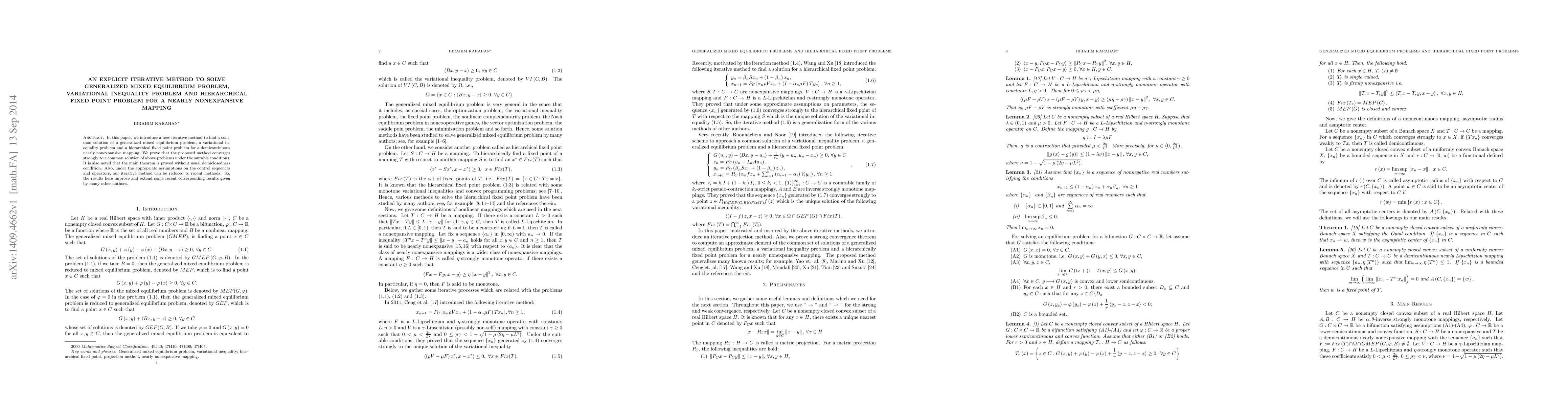 The paper introduces an explicit iterative method to find a common solution for a generalized mixed equilibrium problem, a variational inequality problem, and a hierarchical fixed point problem for a nearly nonexpansive mapping.