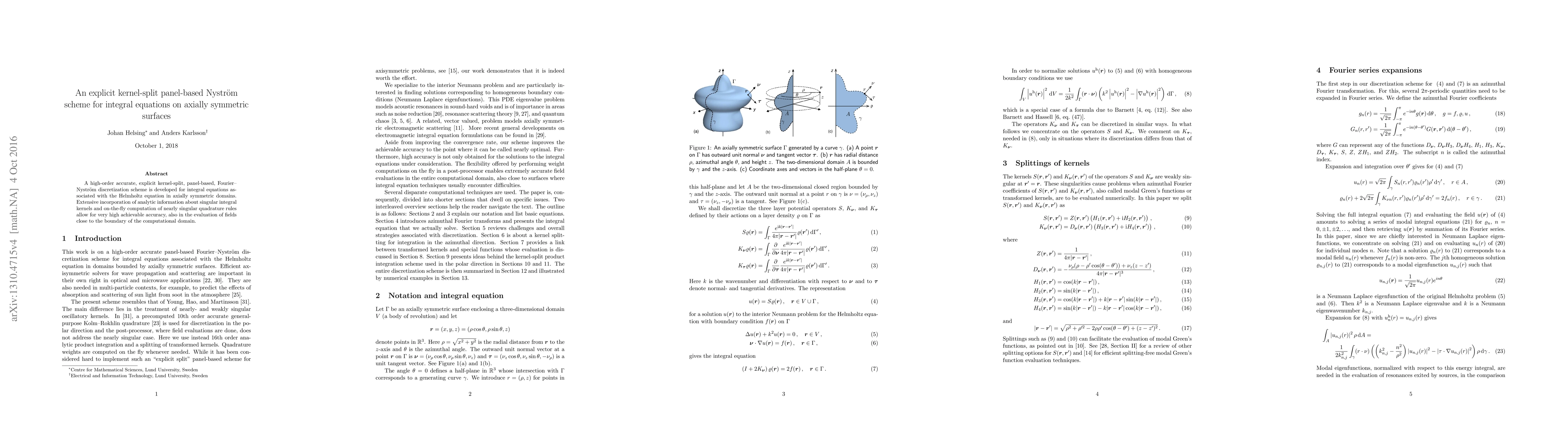 This paper presents a high-order, explicit method using kernel-splitting and panel-based Fourier-Nyström discretization for solving integral equations related to the Helmholtz equation in axially symmetric domains. The method leverages analytic knowledge of singular kernels and computes nearly singular quadrature rules on-the-fly, enabling high accuracy in field evaluations near the domain boundary.