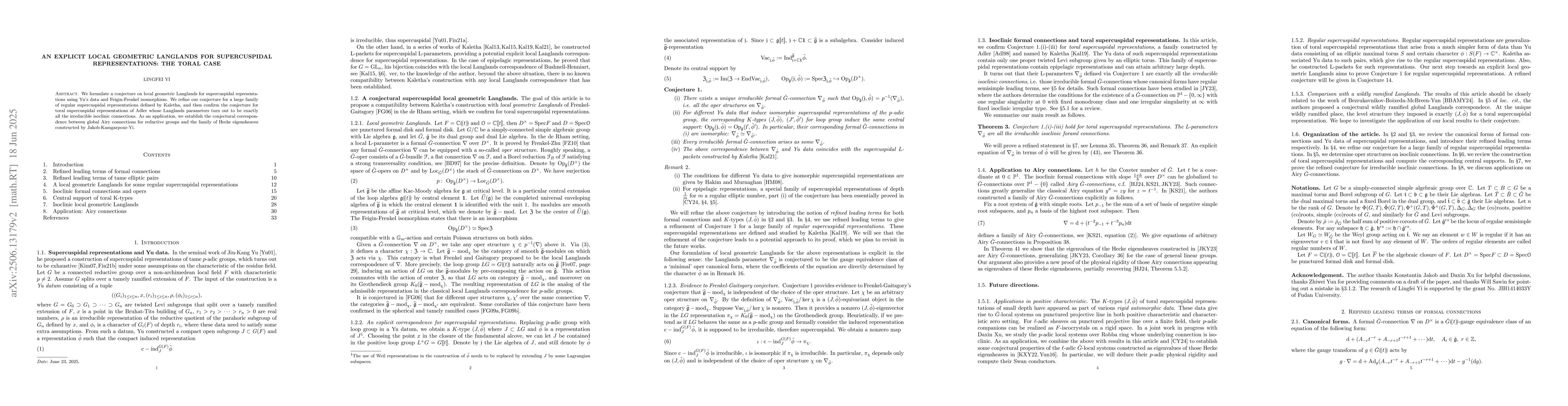 We formulate a conjecture on local geometric Langlands for supercuspidal representations using Yu's data and Feigin-Frenkel isomorphism. We refine our conjecture for a large family of regular supercuspidal representations defined by Kaletha, and then confirm the conjecture for toral supercuspidal representations of Adler whose Langlands parameters turn out to be exactly all the irreducible isoclinic connections. As an application, we establish the conjectural correspondence between global Airy connections for reductive groups and the family of Hecke eigensheaves constructed by Jakob-Kamgarpour-Yi.