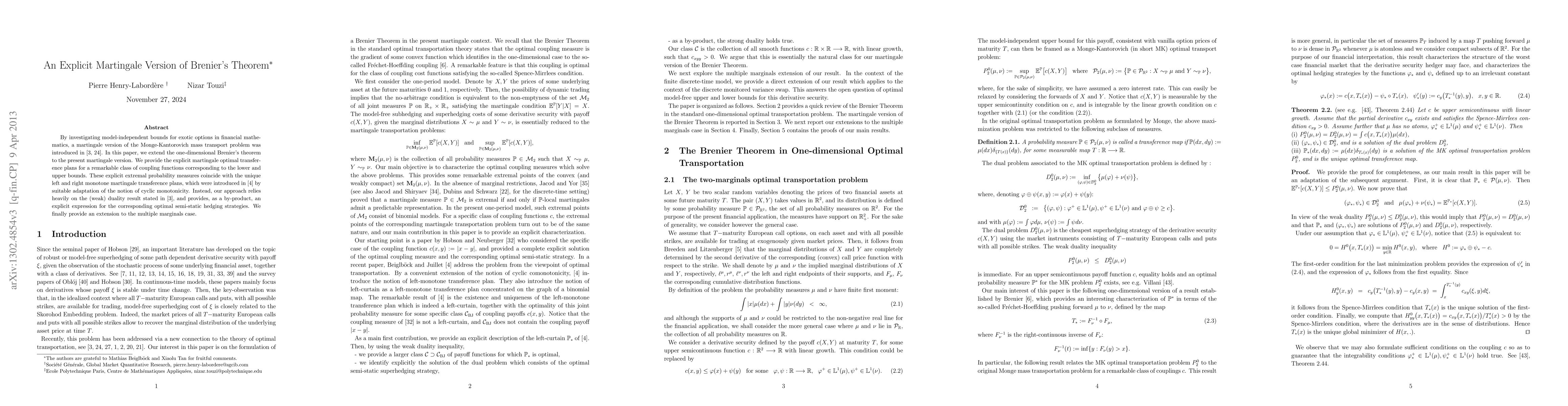 This paper extends Brenier's theorem to a martingale version, providing explicit martingale optimal transference plans for a class of coupling functions. It also offers an explicit expression for optimal semi-static hedging strategies and extends the results to multiple marginals.