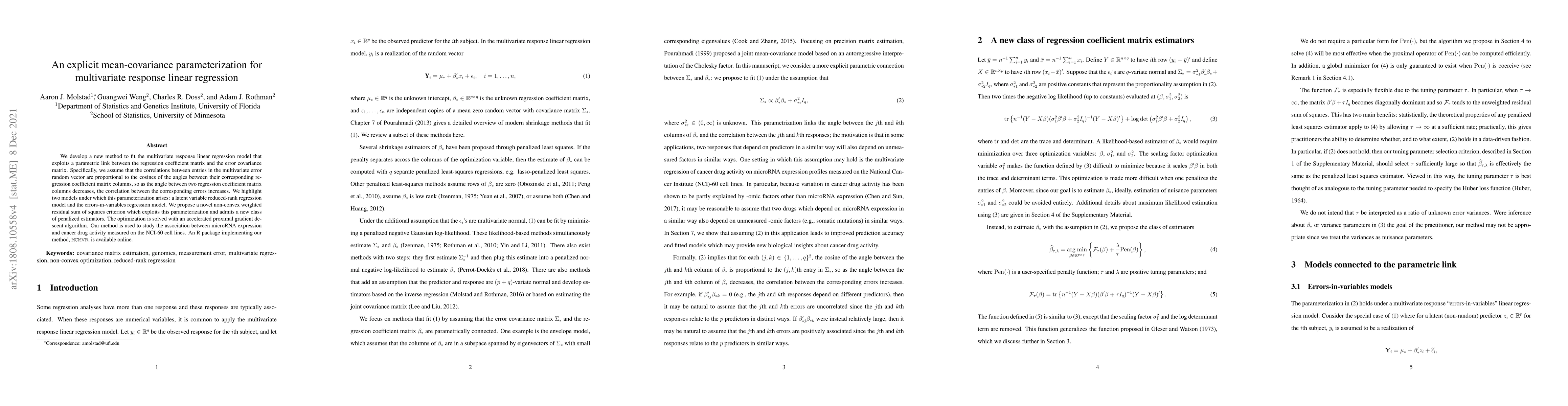 This paper introduces a novel mean-covariance parameterization for multivariate response linear regression, linking regression coefficients to error covariance through angles between coefficient columns. It proposes a non-convex optimization criterion and an accelerated proximal gradient descent algorithm, and applies the method to study microRNA expression and cancer drug activity.