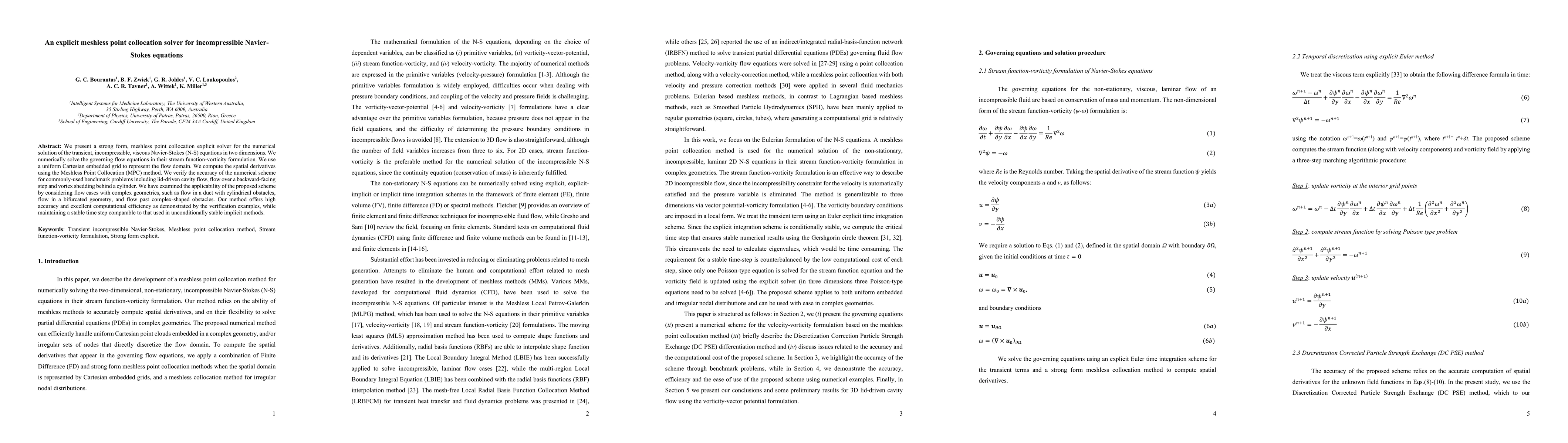This paper introduces an explicit meshless point collocation solver for transient, incompressible Navier-Stokes equations in 2D, using stream function-vorticity formulation and verifying accuracy through benchmark problems and complex geometries. The method demonstrates high accuracy and computational efficiency with stable time steps.