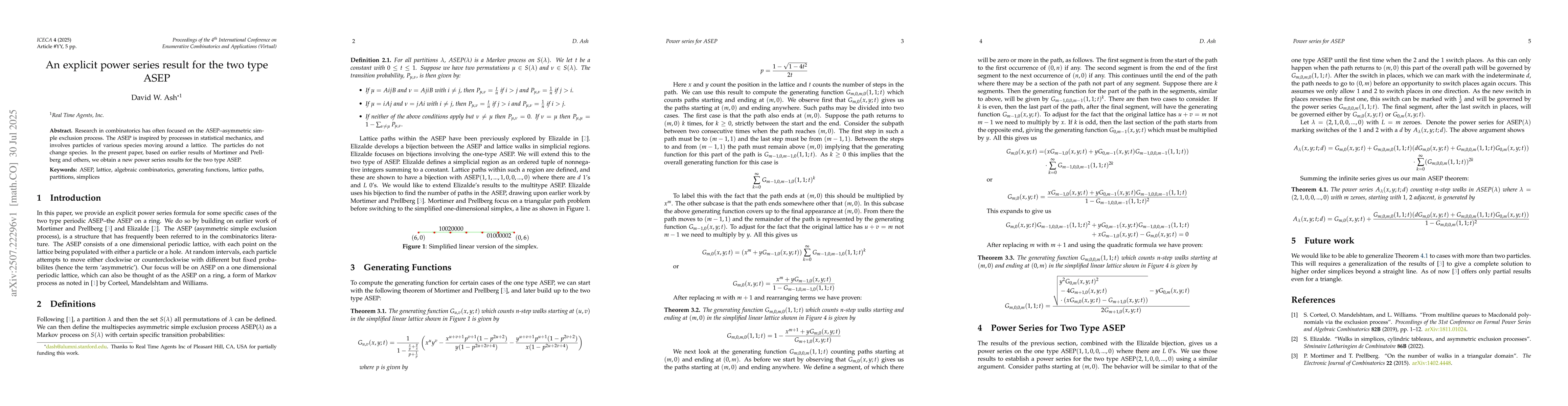 Research in combinatorics has often focused on the ASEP (asymmetric simple exclusion process). The ASEP is inspired by processes in statistical mechanics, and involves particles of various species moving around a lattice. The particles do not change species. In the present paper, based on earlier results of Mortimer and Prellberg and others, we obtain a new power series results for the two type ASEP.