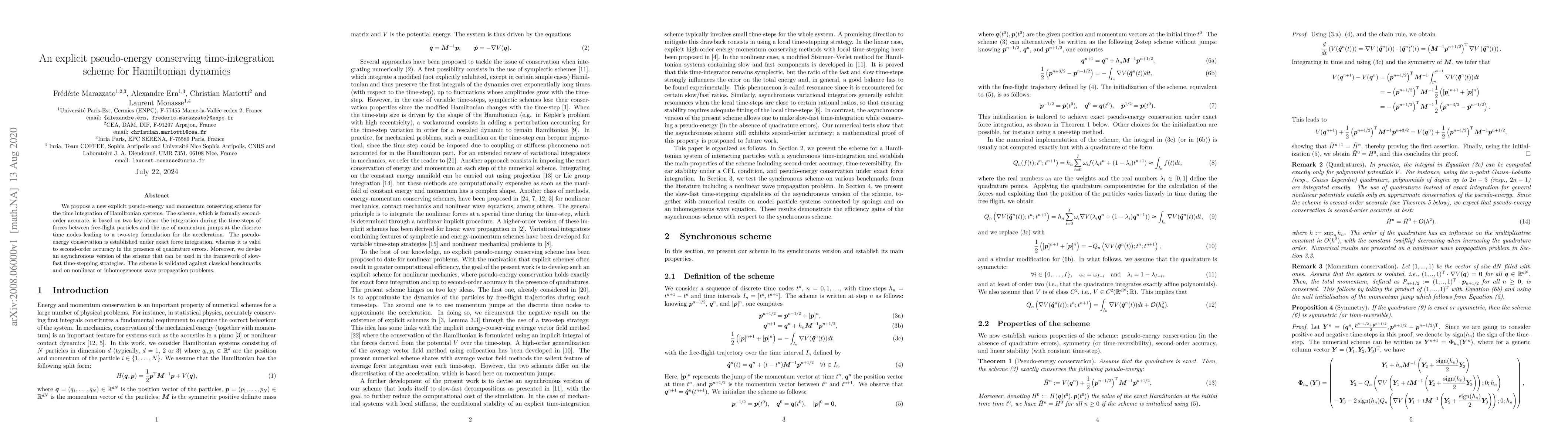 We propose a new explicit pseudo-energy and momentum conserving scheme for the time integration of Hamiltonian systems. The scheme, which is formally second-order accurate, is based on two key ideas: the integration during the time-steps of forces between free-flight particles and the use of momentum jumps at the discrete time nodes leading to a two-step formulation for the acceleration. The pseudo-energy conservation is established under exact force integration, whereas it is valid to second-order accuracy in the presence of quadrature errors. Moreover, we devise an asynchronous version of the scheme that can be used in the framework of slow-fast time-stepping strategies. The scheme is validated against classical benchmarks and on nonlinear or inhomogeneous wave propagation problems.